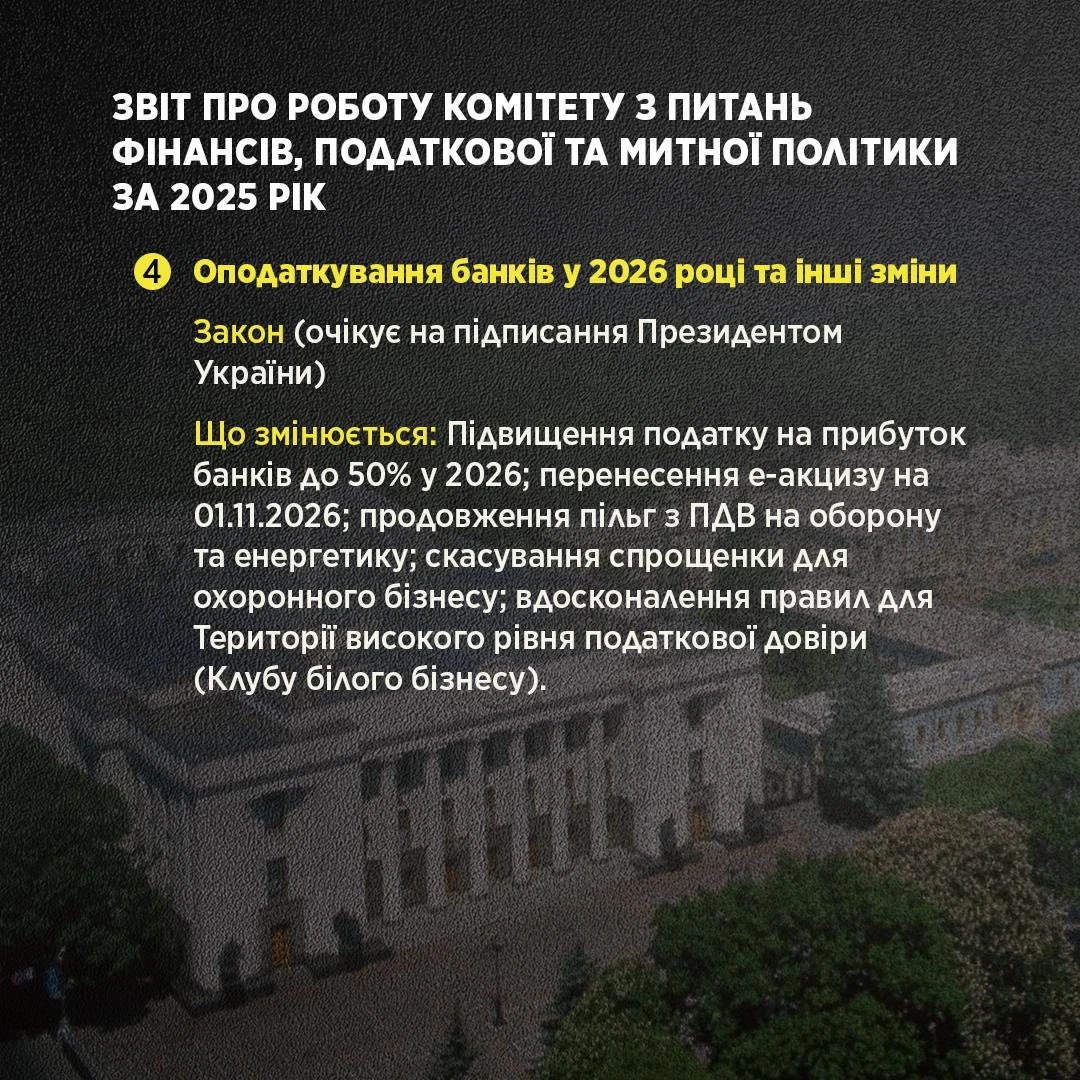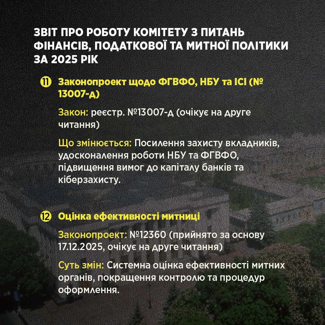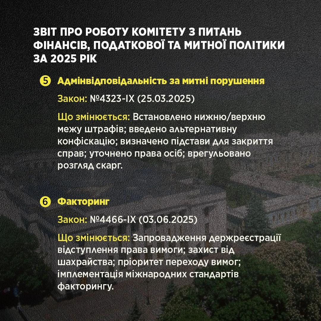 Голова Комітету ВРУ з питань фінансів, податкової та митної політики Данило Гетманцев представив інфографіку, яка демонструє підсумки діяльності комітету за 2025 рік