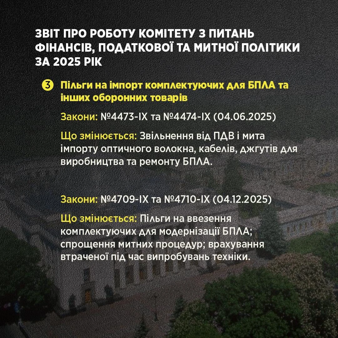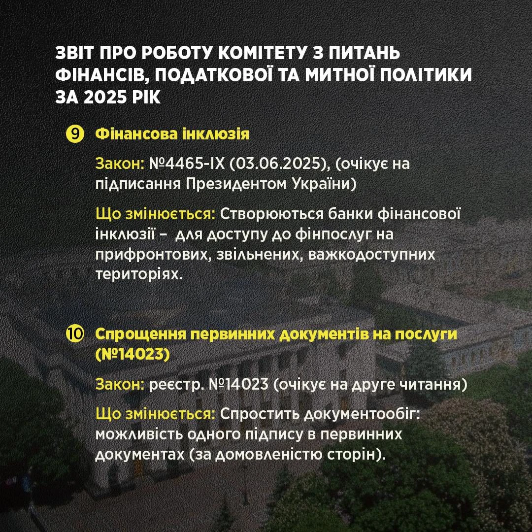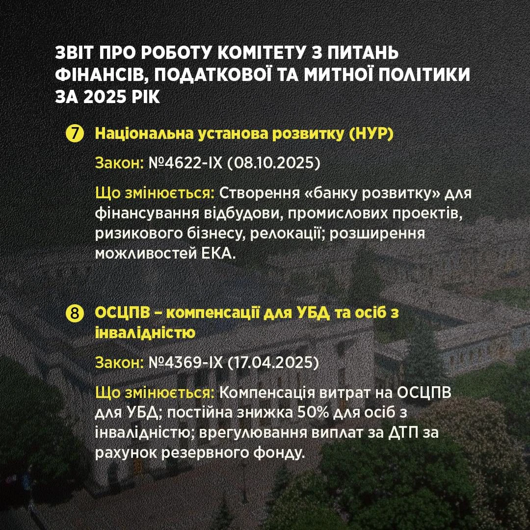 Голова Комітету ВРУ з питань фінансів, податкової та митної політики Данило Гетманцев представив інфографіку, яка демонструє підсумки діяльності комітету за 2025 рік
