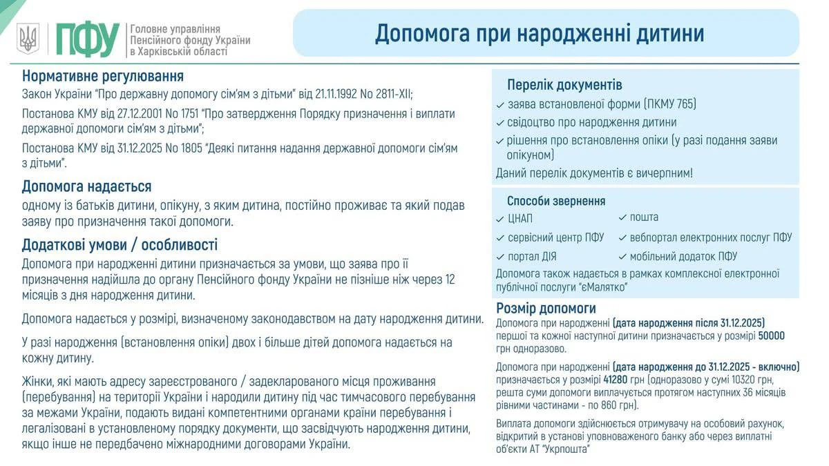 Допомога при народженні дитини, яка народилася до 31 грудня 2025 р. надається відповідно до Порядку призначення і виплати державної допомоги сім’ям з дітьми, затвердженого постановою КМУ від 27.12.2001 №1751 (зі змінами 2025 року). А саме допомога при народженні першої та кожної наступної дитини, яка народилася після 30 червня 2014 р., надається у розмірі 41280 грн. Виплата допомоги здійснюється одноразово у сумі 10320 гривень, решта суми допомоги виплачується протягом наступних 36 місяців рівними частинами.