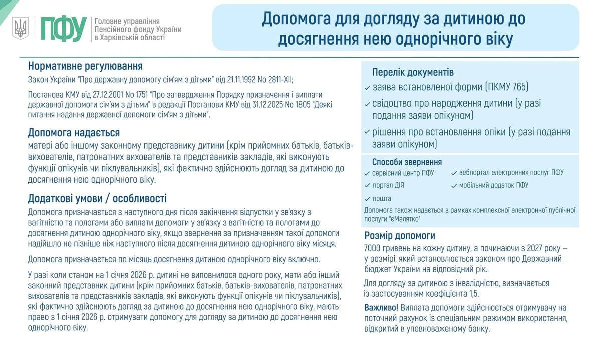 - Допомога для догляду за дитиною до 1 року у 2026 році становить 7 000 грн щомісяця, а для дитини з інвалідністю – 10 500 грн, і витрачати її можна лише в тих госпсуб'єктів, які мають відповідні коди МСС.