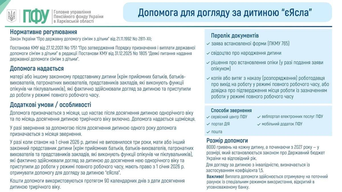 - Допомога «єЯсла» (8 000 грн щомісяця у 2026 році) надається матері або іншому законному представнику дитини, які фактично здійснювали догляд за дитиною та приступили до роботи у режимі повного робочого часу та укладення договору з визначеними надавачами послуг догляду.