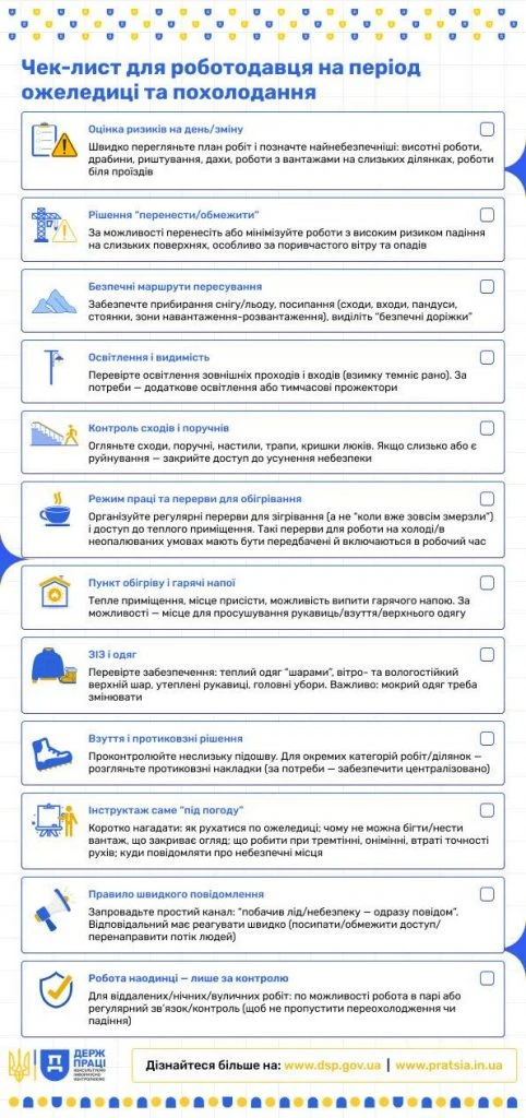 - Проводьте інструктажі з охорони праці з урахуванням зимових ризиків.