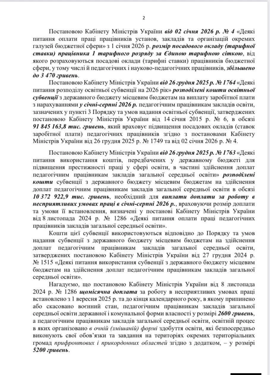 Зокрема, постановою КМУ від 26.12.2025 №1749 установлено, що з 01.01.2026 відбудеться підвищення на 40 відсотків посадових окладів (ставок заробітної плати) педагогічних і науково-педагогічних працівників, перелік посад яких затверджено постановою КМУ від 14.06.2000 №963 «Про затвердження переліку посад педагогічних та науково-педагогічних працівників», закладів та установ державної і комунальної форми власності незалежно від їх підпорядкування.