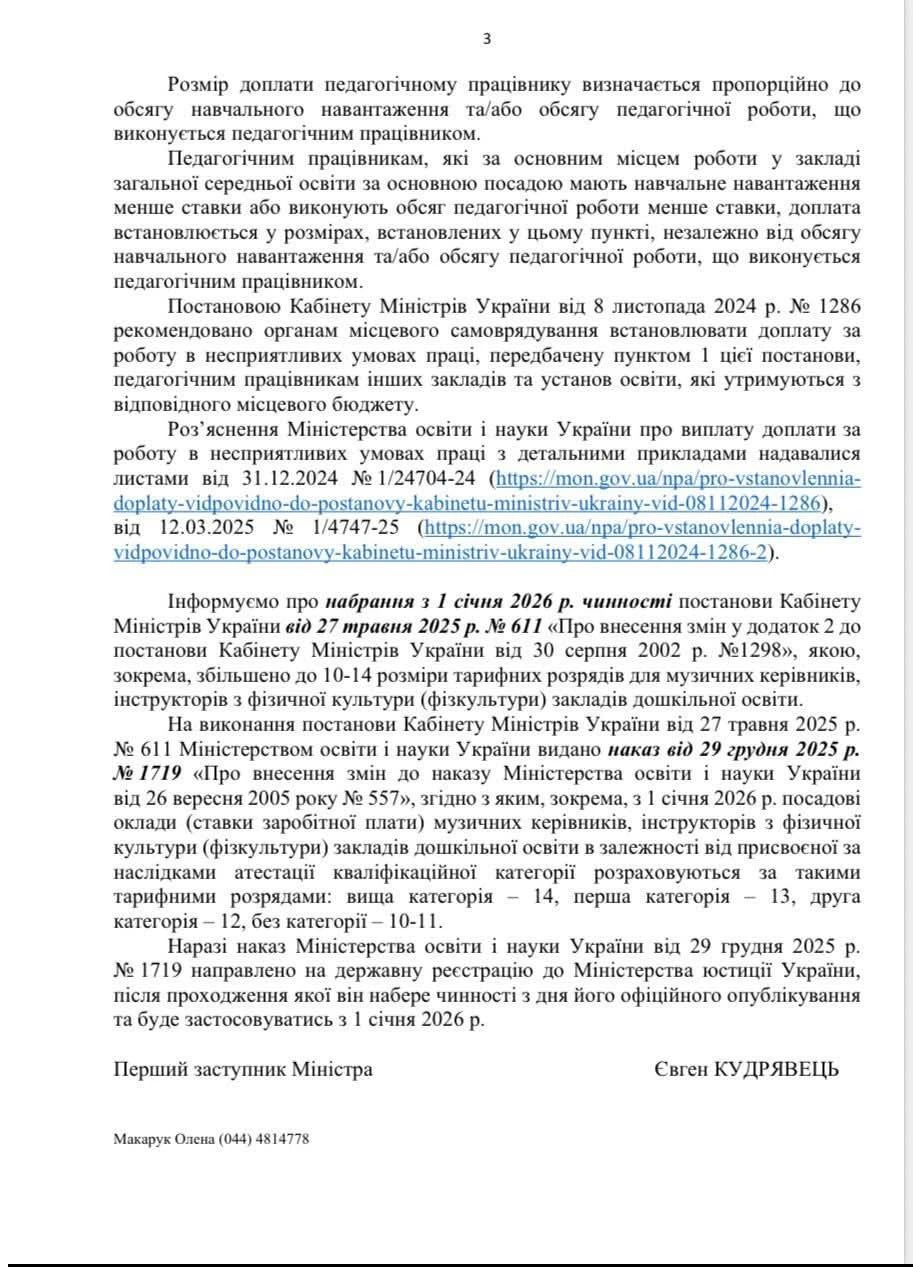 Крім того, відповідно до наказу МОН від 29.12.2025 №1719 визначено з 01.01.2026, посадові оклади (ставки заробітної плати) музичних керівників, інструкторів з фізичної культури (фізкультури) закладів дошкільної освіти, в залежності від присвоєної за наслідками атестації кваліфікаційної категорії розраховуються за такими тарифними розрядами:
