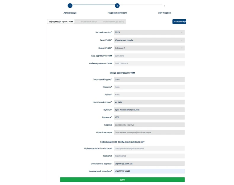 - код ЄДРПОУ/РНОКПП та найменування СПФМ заповнюються автоматично з КЕП/УЕП.
