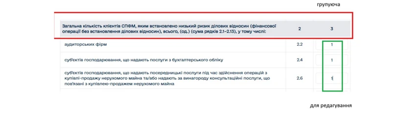 Згідно обраних видів діяльності СПФМ система формує екранну форму для внесення даних, які відносяться тільки до обраних видів СПФМ. Форма містить комірки відкриті для внесення даних (поле для введення виділене/обведене сірим прямокутником) і закриті для редагування, які є сумуючими.