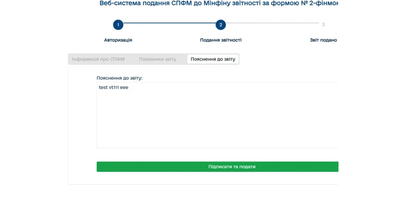 Для подання заповненого звіту до Мінфіну необхідно натиснути кнопку «Підписати та подати». Після підписання та подання звіту до Мінфіну на екрані відображається інформація про поданий звіт: