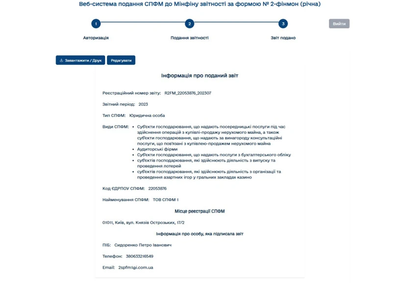 Статус документа змінився на «Звіт подано». На вказану при реєстрації електронну пошту буде відправлено лист підтвердження подання звіту. Також доступні функції «Завантажити/друк» та «Редагування».