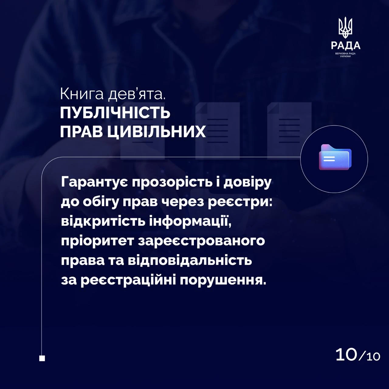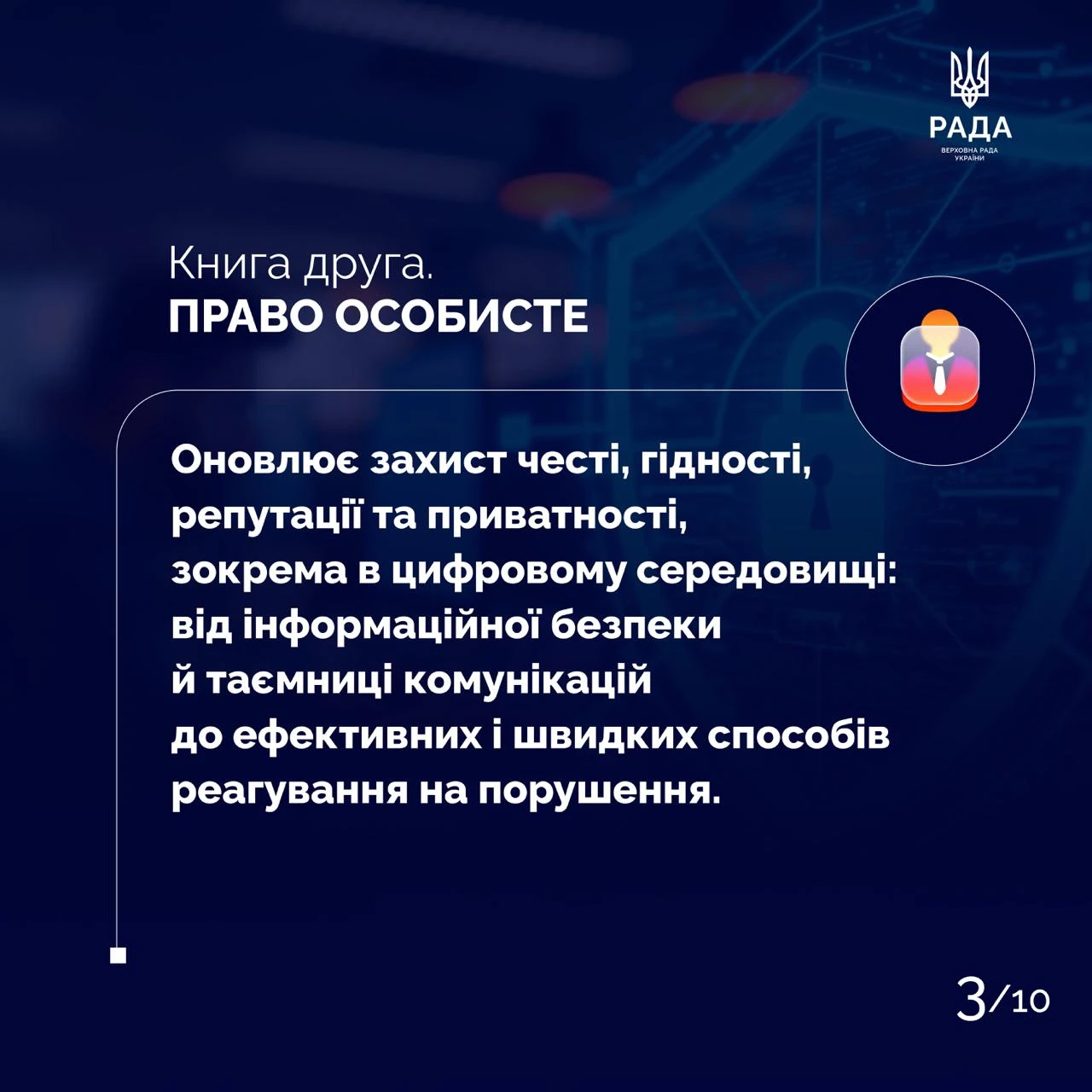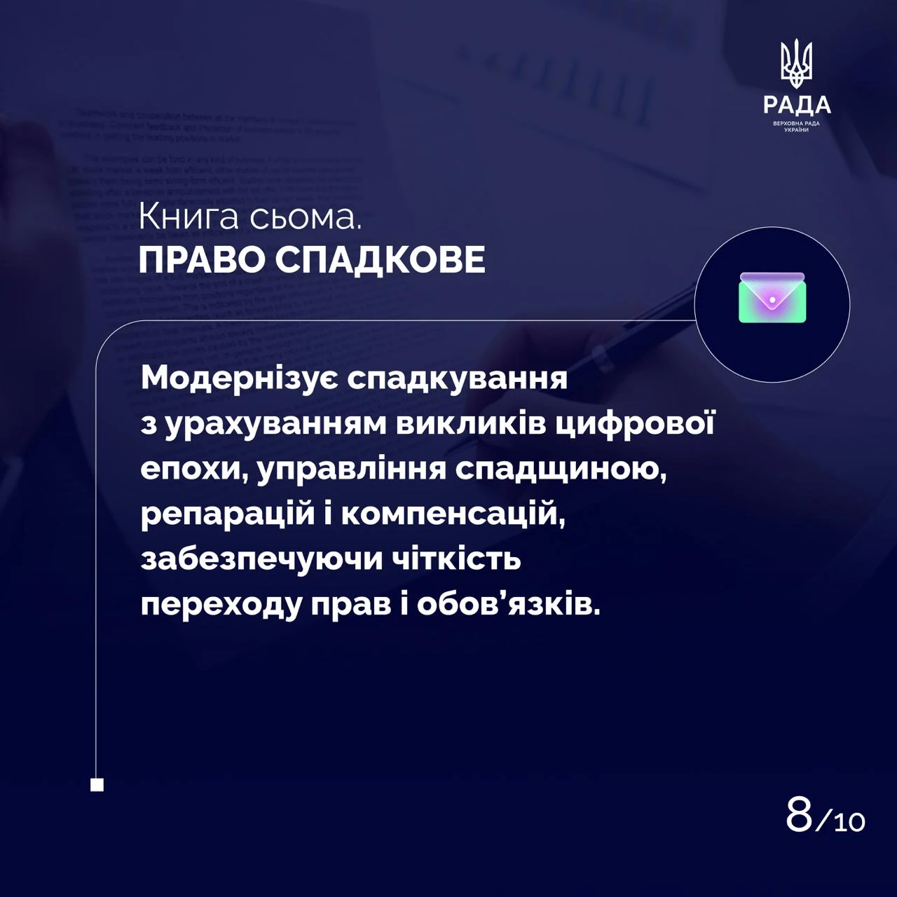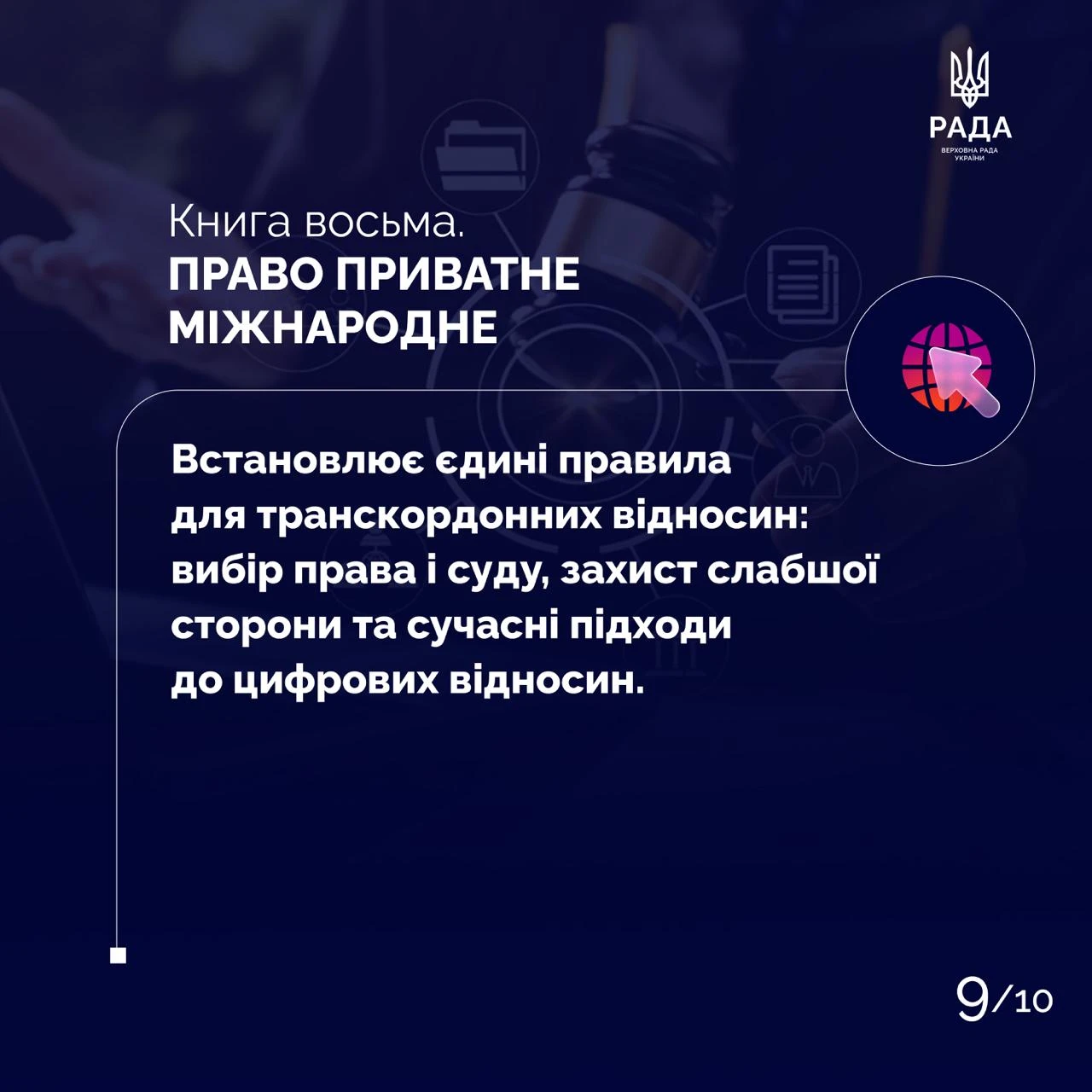У ВРУ зареєстровано законопроєкт №14394 «Цивільний кодекс України (Кодекс права приватного)», який спрямований на формування сучасної нормативної основи для регулювання приватних відносин, що відповідає викликам XXI століття (цифровізація, розвиток нових економічних моделей, трансформація майнового обігу, ускладнення договірних та недоговірних конструкцій, транскордонність відносин) та забезпечує належний рівень юридичної визначеності, справедливості, ефективного захисту цивільних прав та інтересів.