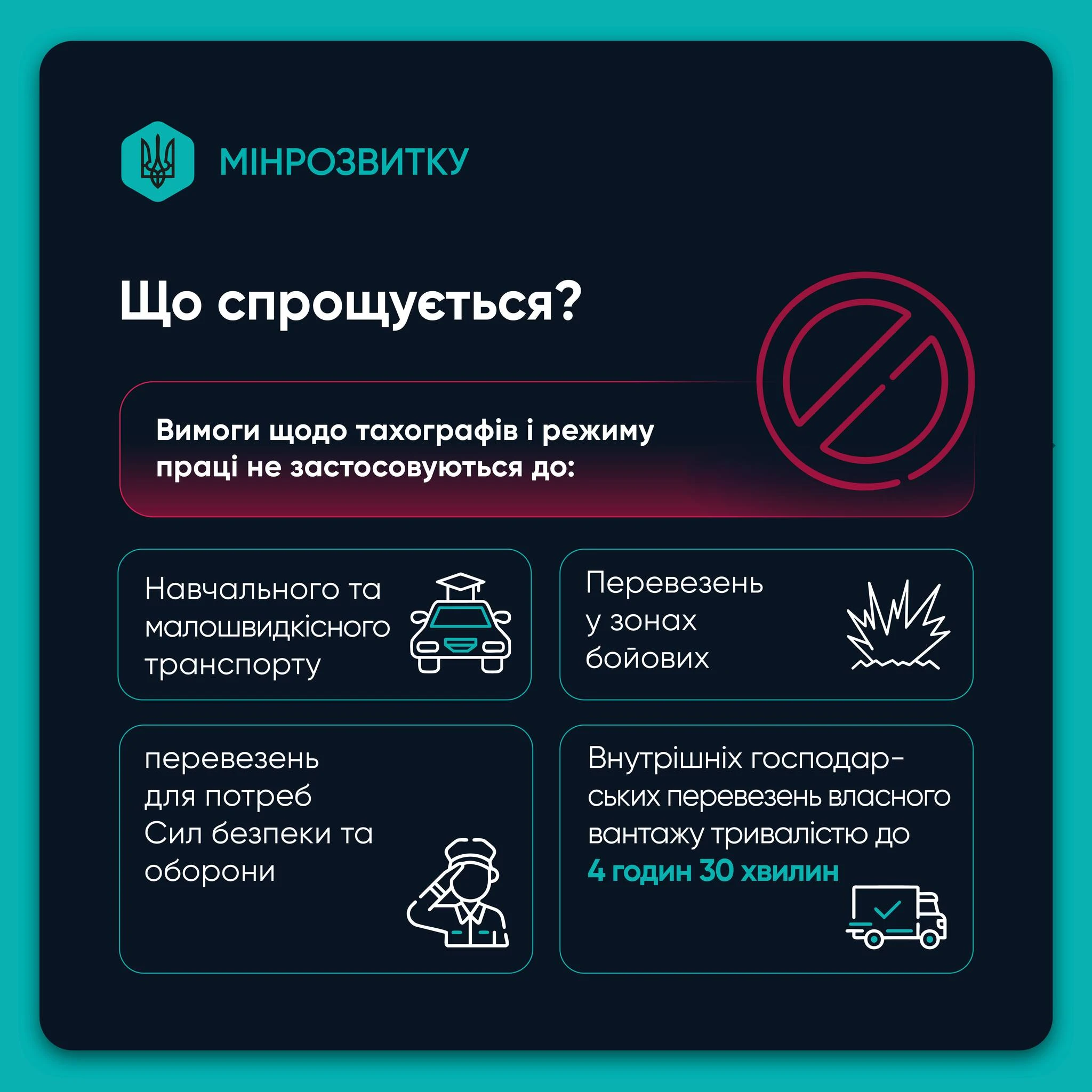 - обовʼязкове використання справних тахографів для перевезень, на які поширюються вимоги.