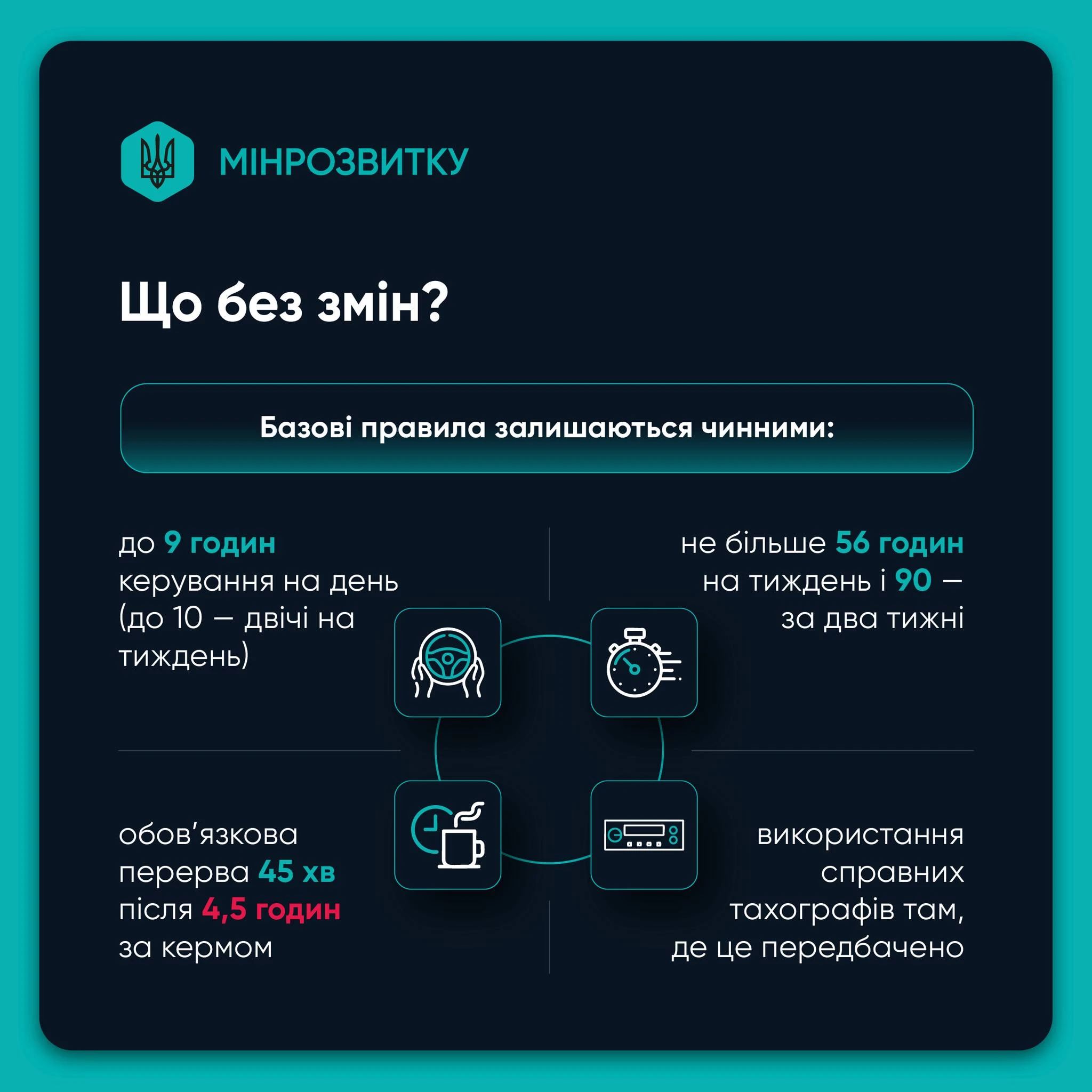- чіткі норми керування та відпочинку (9 год/день, 56 год/тиждень, перерва після 4,5 год);