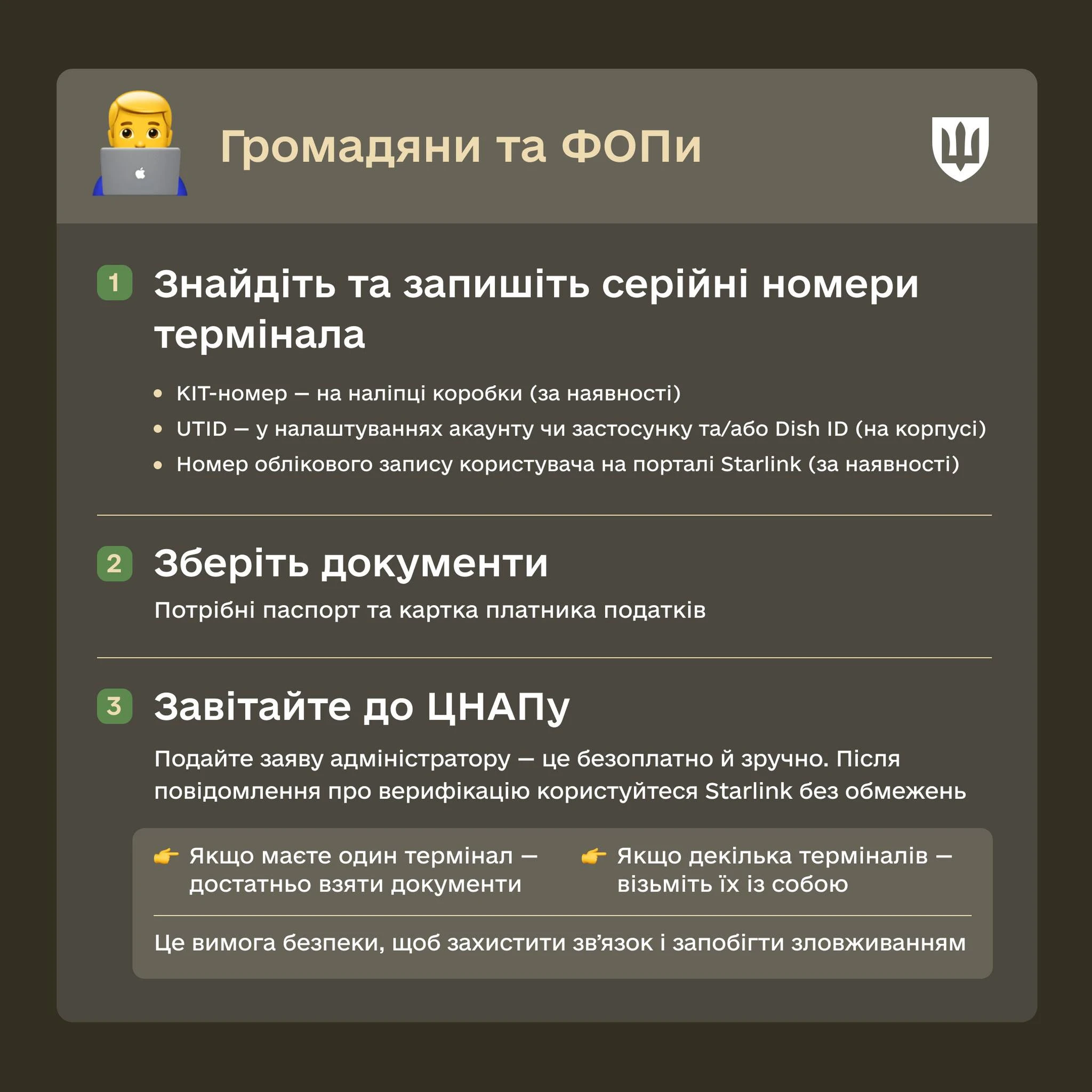 Важливо, поширюйте. Підготували інструкцію з верифікації терміналів Starlink для військових і цивільних українців, зокрема для підприємців і державних службовців.