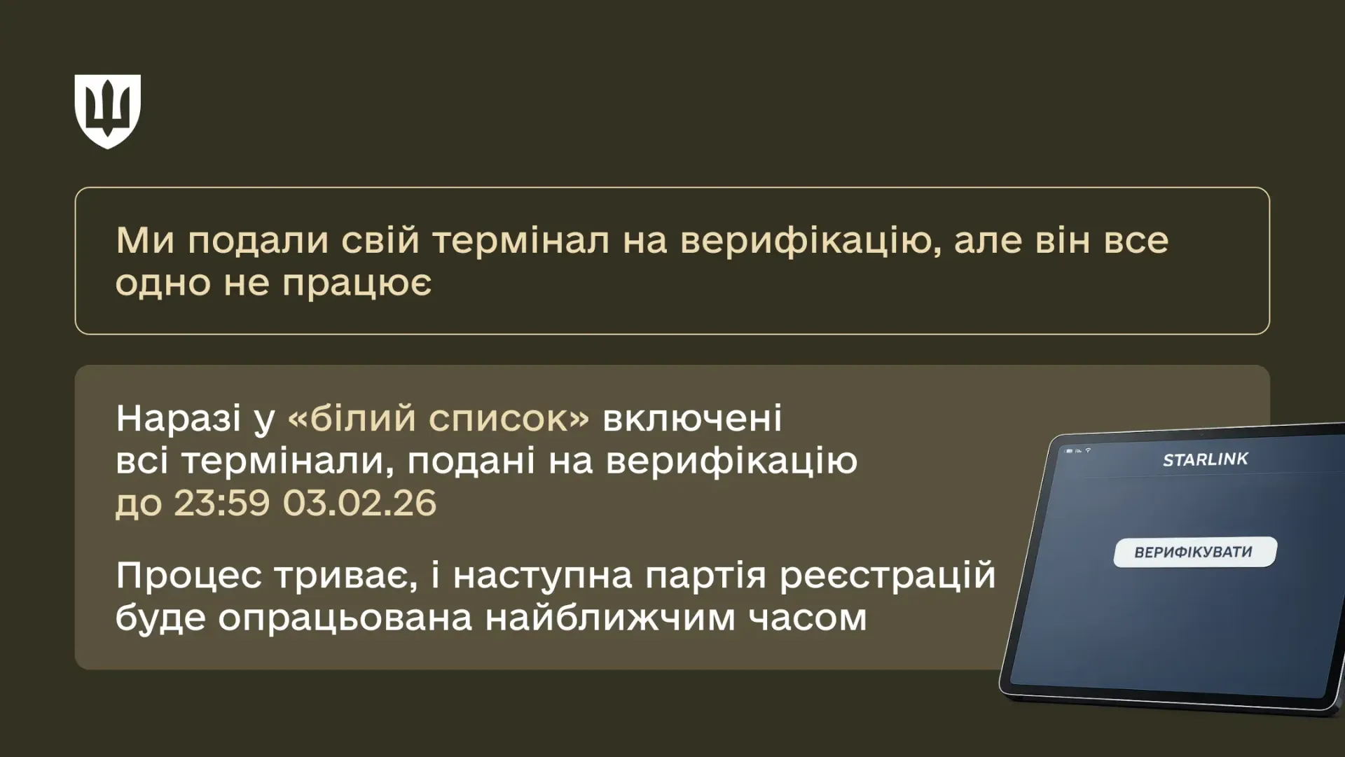 Заблокований термінал Starlink, який лежить на складі, або не встигли подати до «білого списку», можна буде подати на верифікацію. Після внесення до «білого списку» він запрацює.