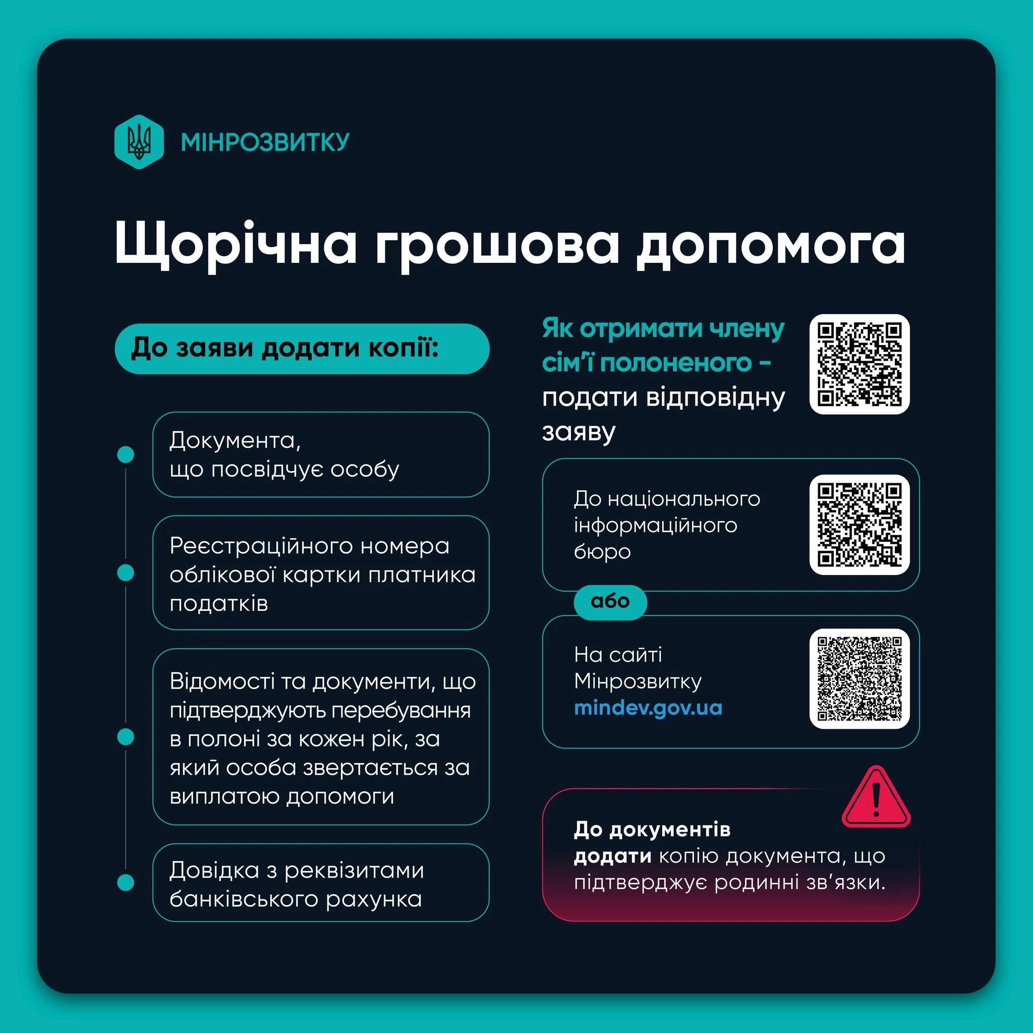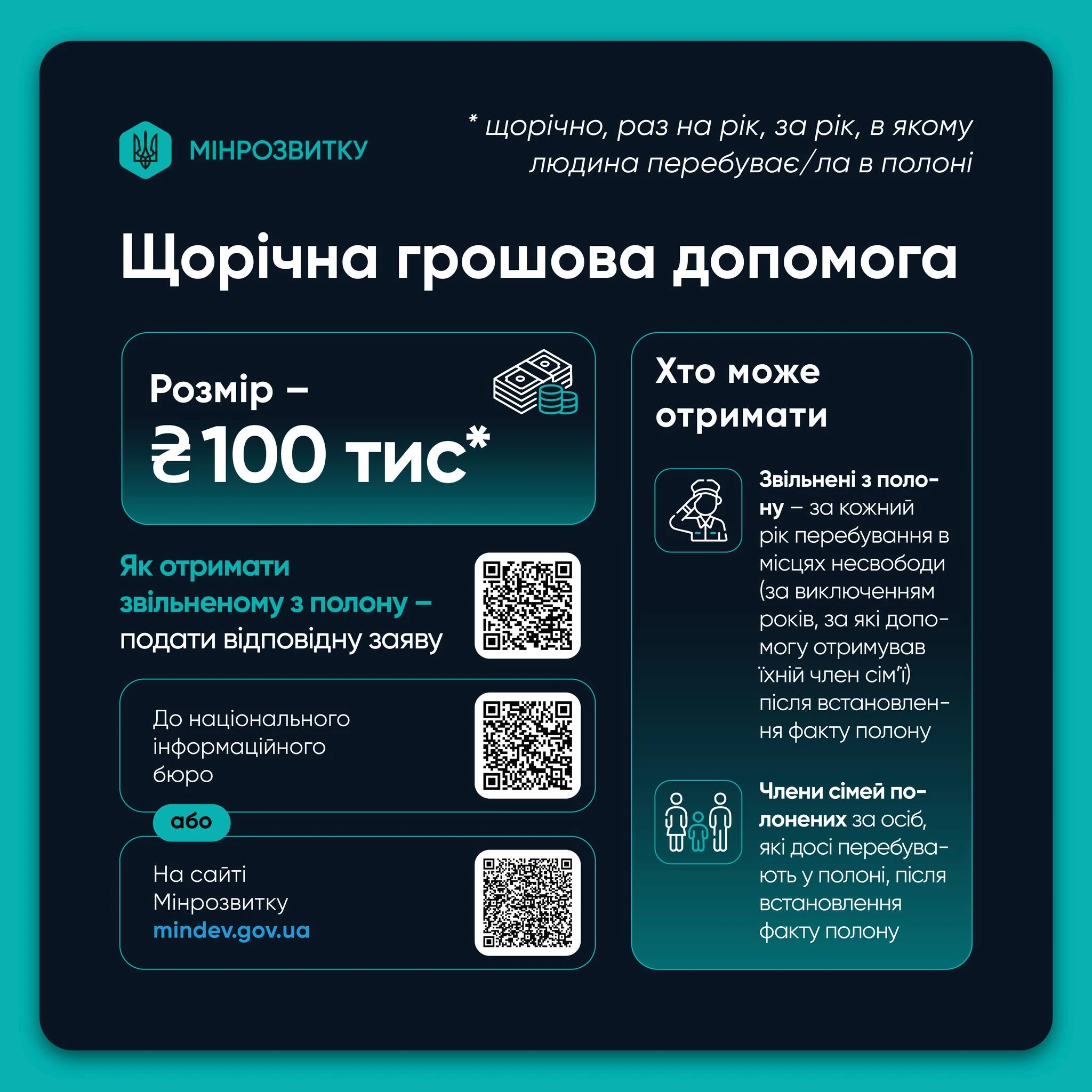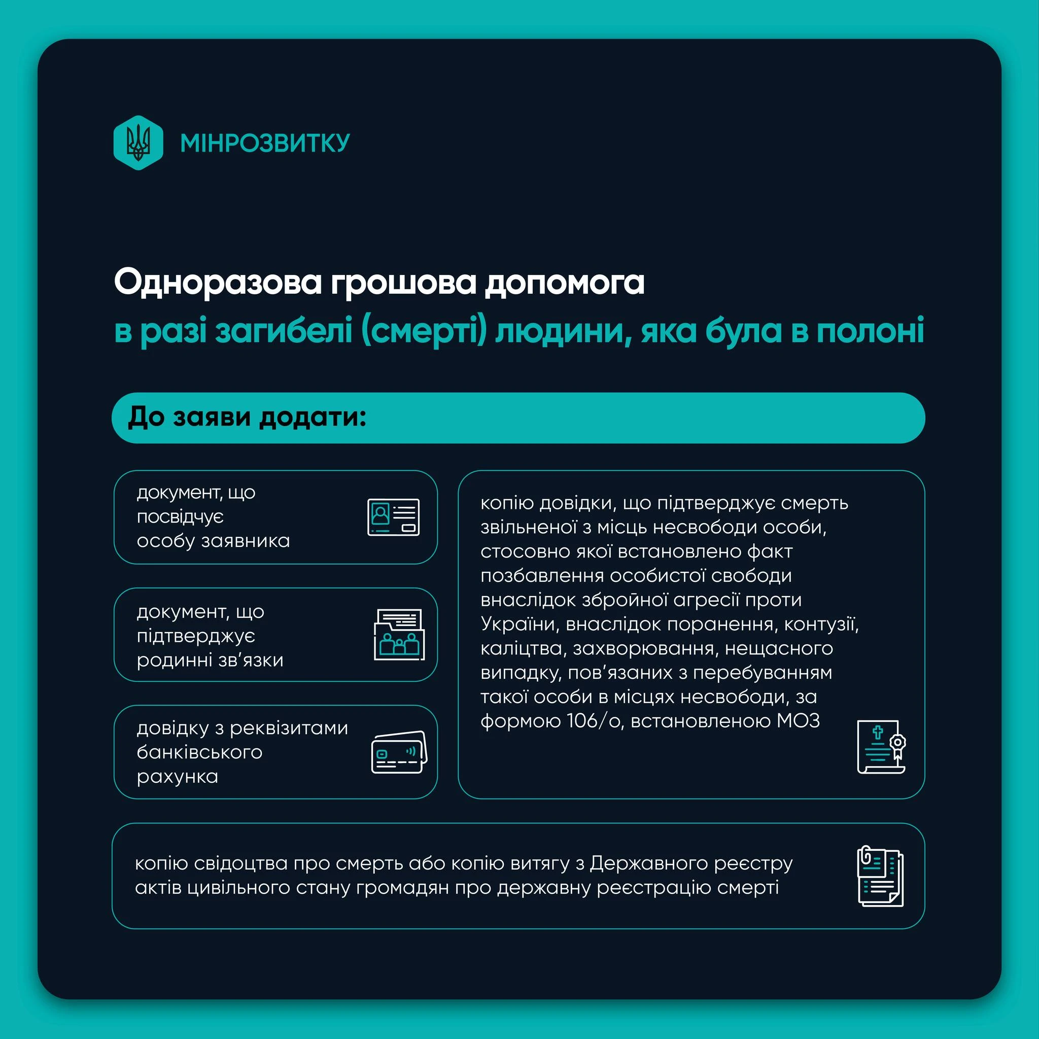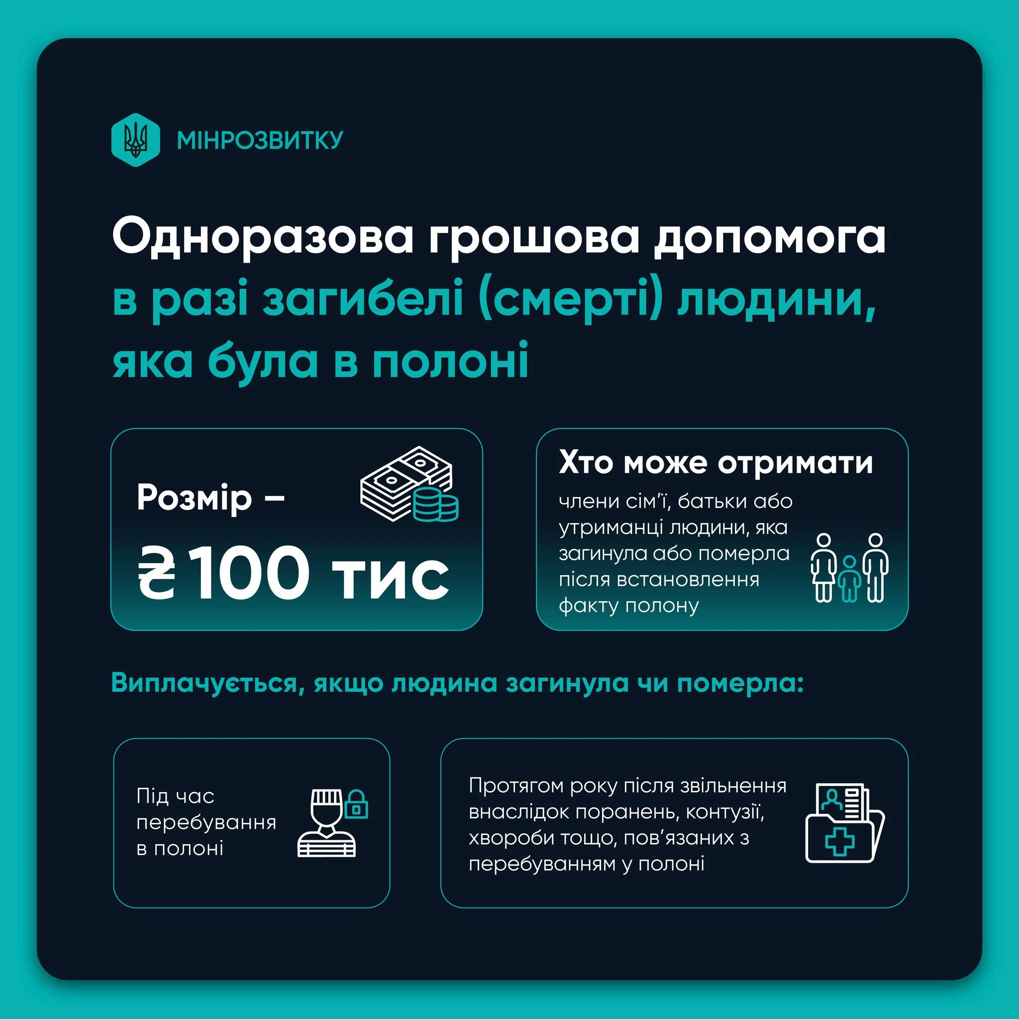 У інфографіці Мінрозвитку розповідає про виплати, які можуть отримати звільнені з полону та родини полонених, а також як їх отримати.