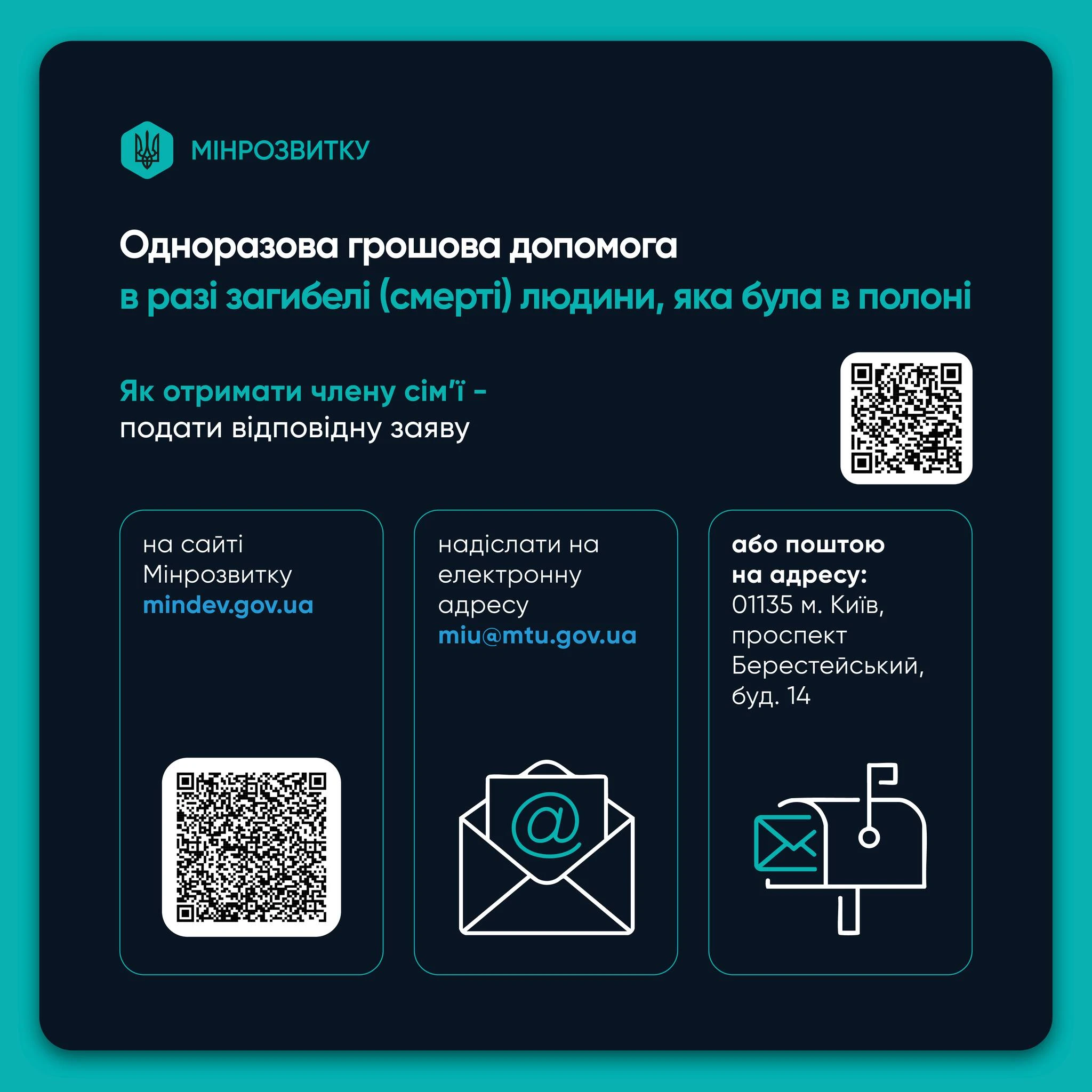 Також документи для отримання вищеперелічених виплат можна надіслати до Міністерства розвитку громад та територій України поштою на адресу 01135 м. Київ, проспект Берестейський, буд. 14 або на електронну пошту miu@mtu.gov.ua.