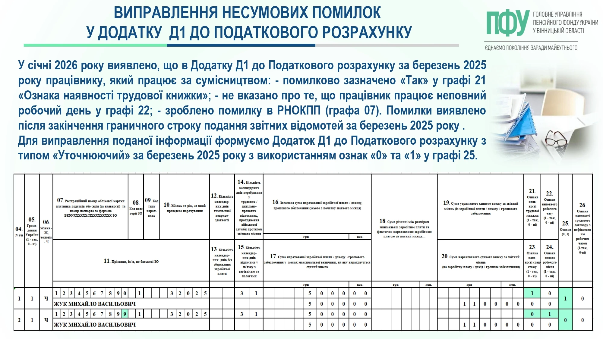 Ситуація 2. У січні 2026 року виявлено, що в Додатку Д1 до Податкового розрахунку за березень 2025 року працівнику, який працює за сумісництвом: