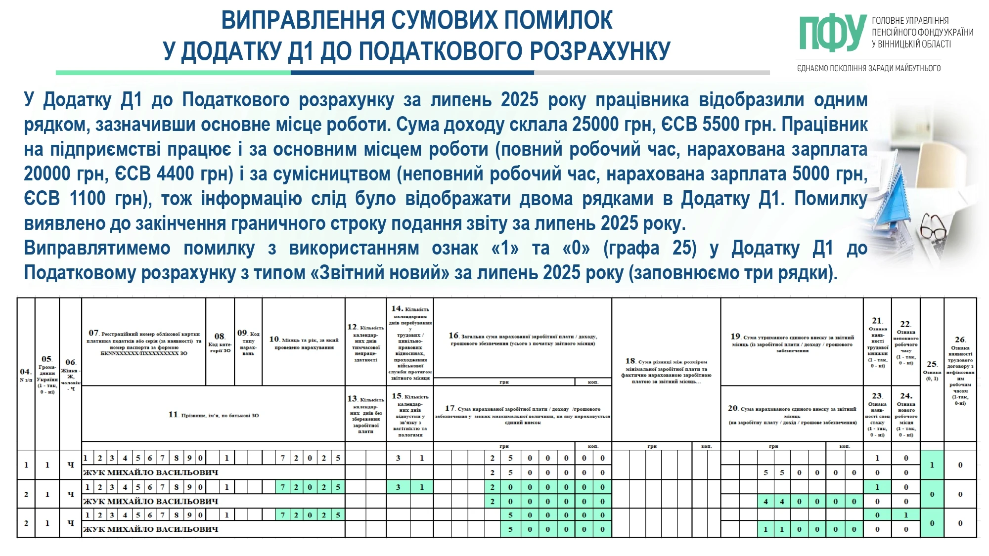 Для виправлення сумової й несумової помилок подаємо Додаток Д1 до Податкового розрахунку за квітень 2025 року з типом «Звітний новий» з використанням ознак «0» та «1» у графі 25.