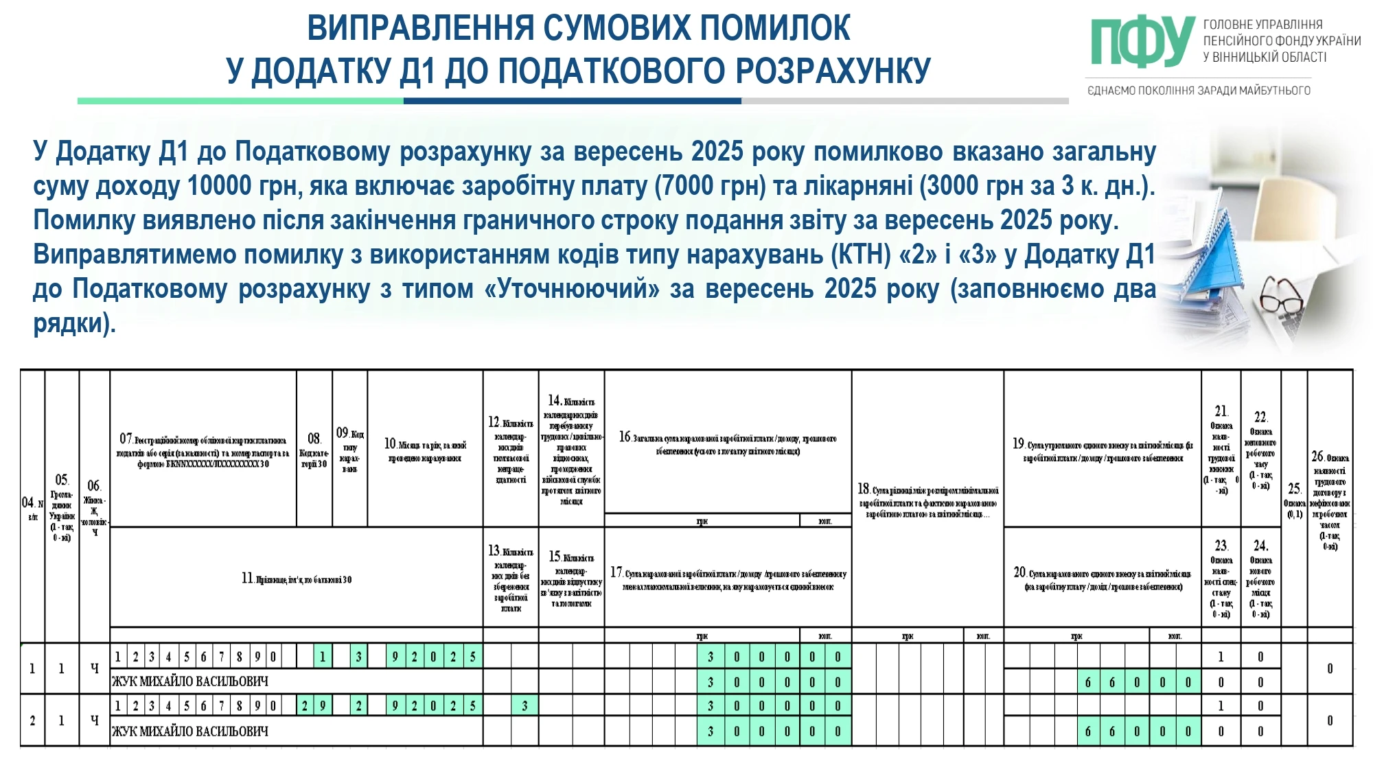 Ситуація 7. У Додатку Д1 до Податкового розрахунку за вересень 2025 року помилково вказано загальну суму доходу 10 000 грн, яка включає заробітну плату (7 000 грн) та лікарняні (3 000 грн за 3 к. дн.).