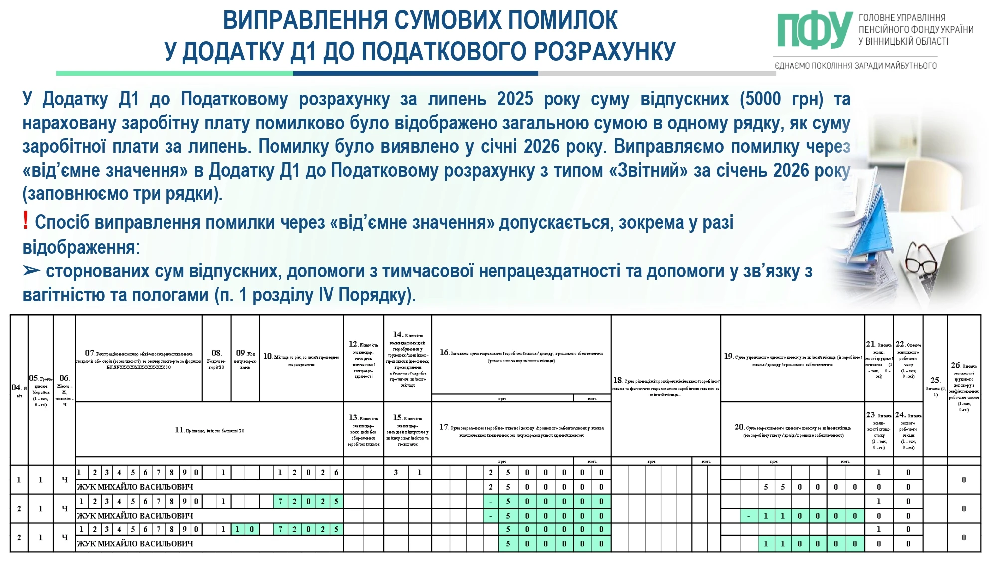 Помилку було виявлено у січні 2026 року. Виправляємо помилку через «від’ємне значення» в Додатку Д1 до Податкового розрахунку з типом «Звітний» за січень 2026 року (заповнюємо три рядки).