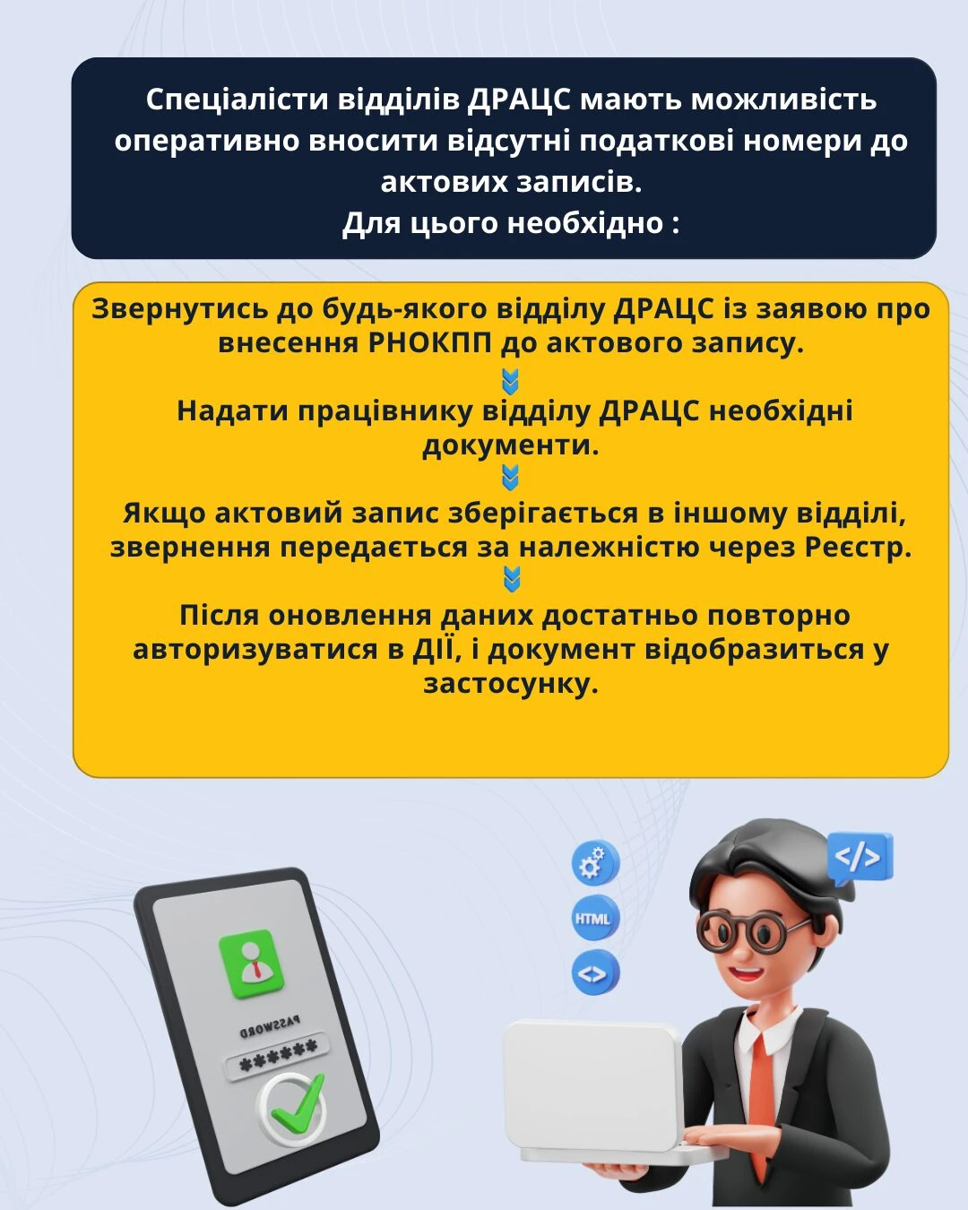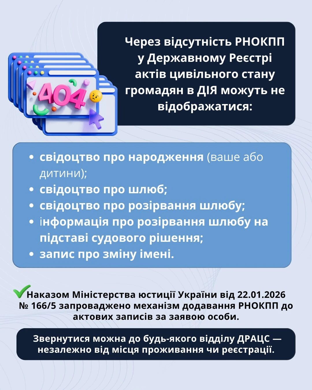 Мін'юстом прийнято наказ від 22.01.2026 №166/5 «Про внесення змін до деяких нормативно-правових актів Міністерства юстиції України», яким передбачено можливість додавання РНОКПП до актових записів за заявою особи через відділи ДРАЦС незалежно від місця проживання чи реєстрації.