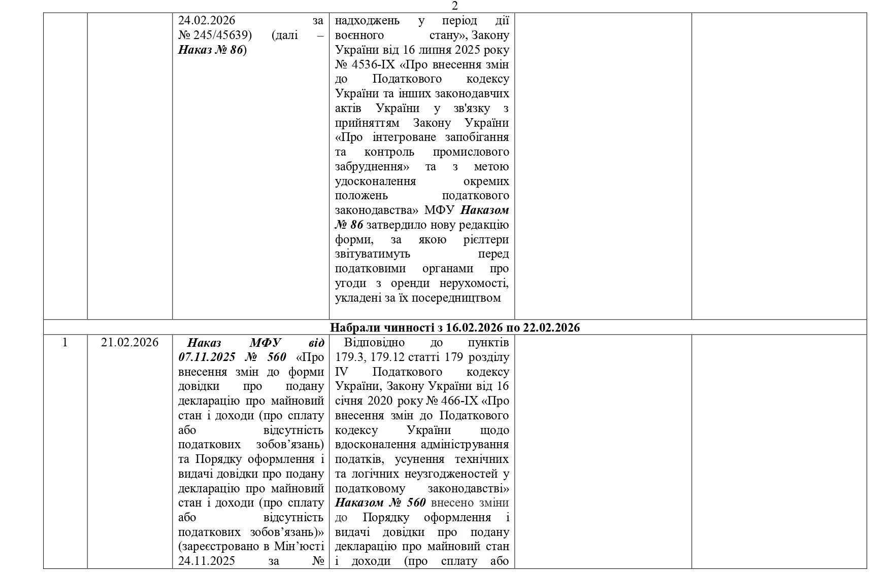 Так, у першій декаді лютого набрали чинності зміни до форми декларації про майновий стан і доходи (Наказ Мінфіну від 05.01.2026 №2), що спрощують подання звітності для фізичних осіб.
