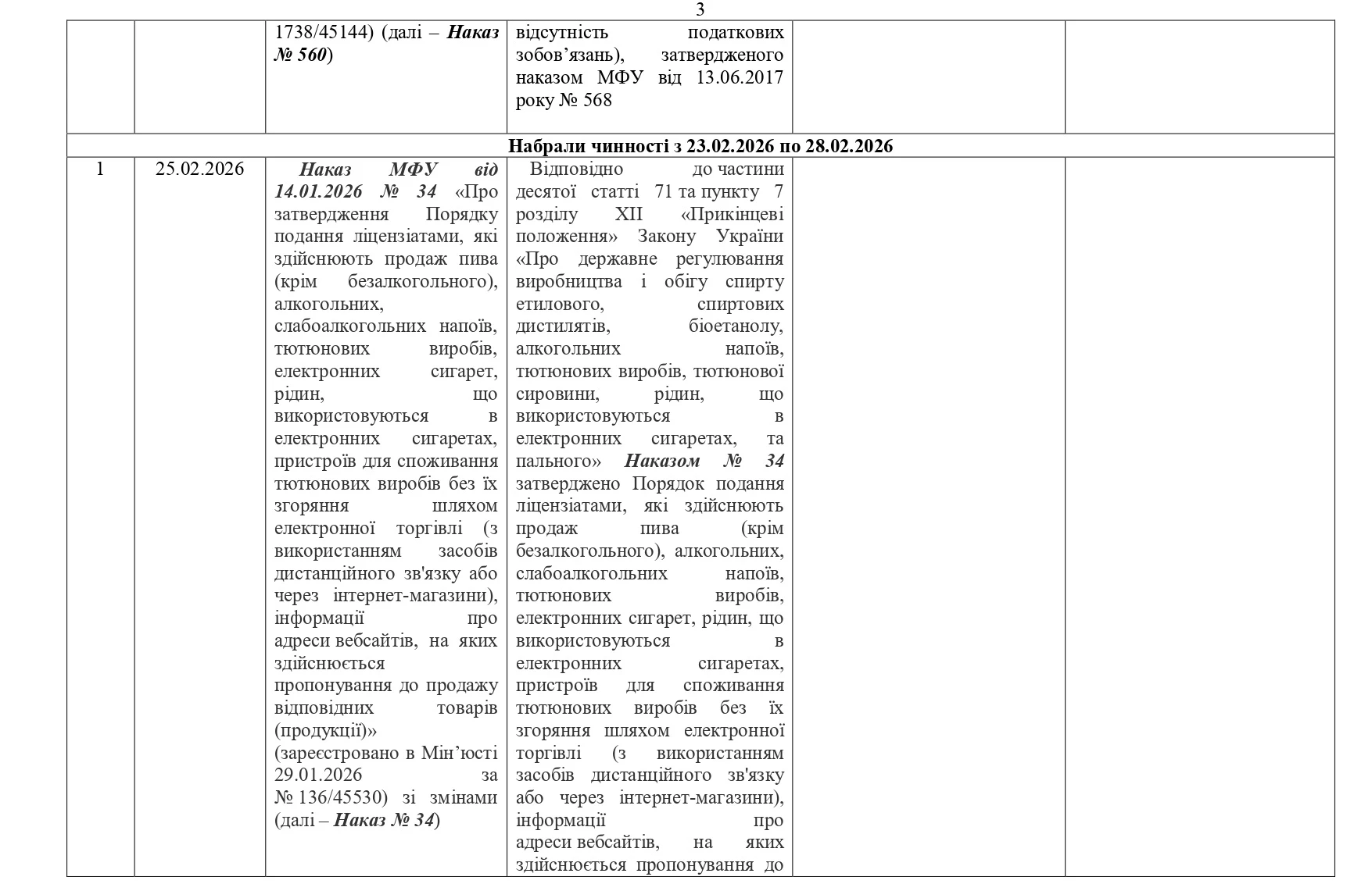 У третій декаді лютого уряд затвердив порядок подання інформації для ліцензіатів з продажу алкоголю, пива, тютюнових виробів та електронних сигарет через інтернет (Наказ Мінфіну від 14.01.2026 №34), а також змінив порядок надсилання податкових повідомлень-рішень (Наказ Мінфіну від 09.10.2025 №513).