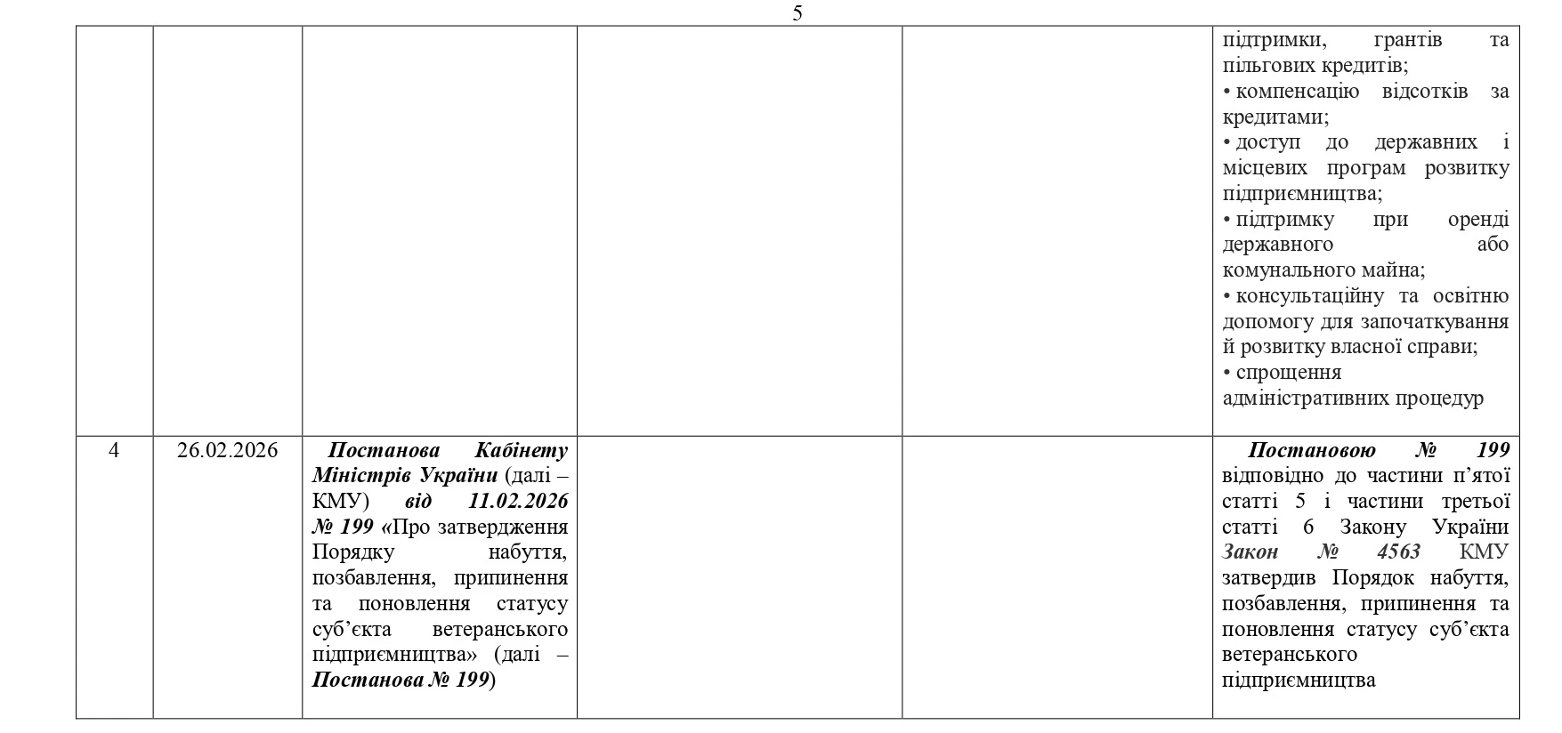 Важливою подією стала державна підтримка ветеранського підприємництва. 26 лютого набрали чинності Закону України від 31.07.2025 №4563-IX «Про ветеранське підприємництво» та Постанова КМУ від 11.02.2026 №199, які визначають статус ветеранського підприємця, спрощують доступ до грантів, пільгових кредитів, оренди державного майна, а також передбачають консультаційну та освітню підтримку для ветеранів, що започатковують власну справу.