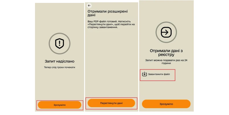 Крок 3. Чекайте сповіщення в застосунку. Надійшло? Тоді тисніть на нього → «Переглянути дані» → «Завантажити файл». Збережіть файл у будь-якому зручному місці.
