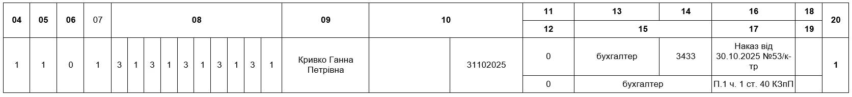 - у наступному рядку в графі 1 зазначають наступний порядковий номер;