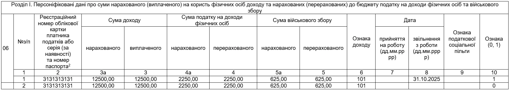 В додатку 1 за жовтень 2025 р. була показана зарплата та компенсація за невикористану відпустку в сумі 13500 грн, та нарахований ЄСВ 2970 грн (13500 грн х 22%). В додатку 4ДФ за жовтень 2025 була відображена в одному рядку зарплата та компенсація за невикористану відпустку в сумі 13500 грн з ознакою доходу «101» та вихідна допомога 11500 із ознакою доходу 127. Також у рядку із зарплатою в графі 8 була зазначена дата звільнення – 31.10.2025. В додатку 5 був заповнений рядок на працівника з інформацією про дату звільнення. |