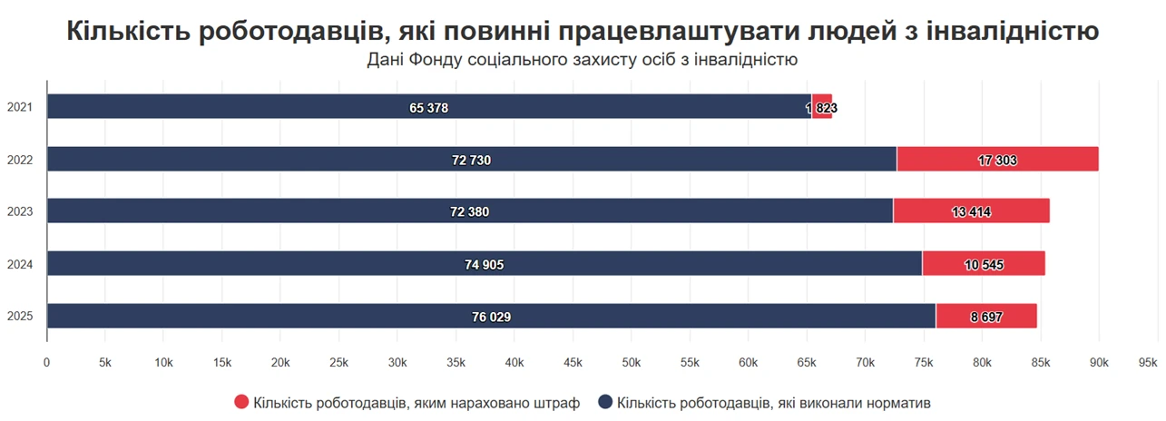 Так, 8 697 роботодавцям, які не виконали норматив, було нараховано санкції на загальну суму 2,76 мільярда гривень. Це близько 10% від усіх роботодавців, які мали працевлаштувати людей з інвалідністю за підсумками 2025 року. Для порівняння, у 2023 році цей показник сягав 17,5%, а до початку повномасштабної війни – лише 2,5%.