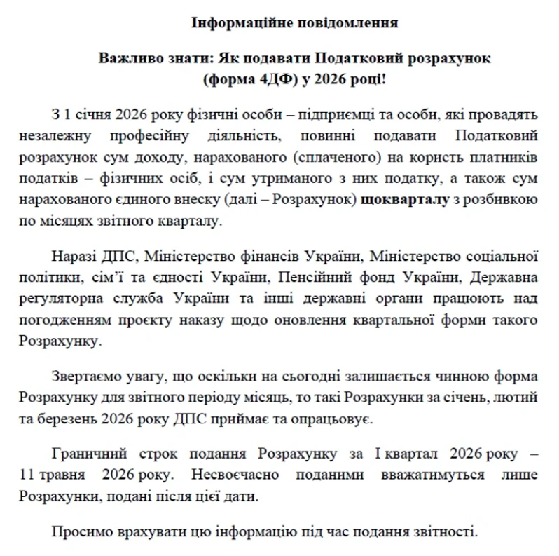 ДПС дозволила тимчасовий вихід: подати розрахунок за І квартал 2026 року по-старому – за місячною формою окремо за січень, лютий і березень до 11.05.2026 (ЗІР, категорія 103.25, повідомлення ГУ ДПС у Херсонській обл.).