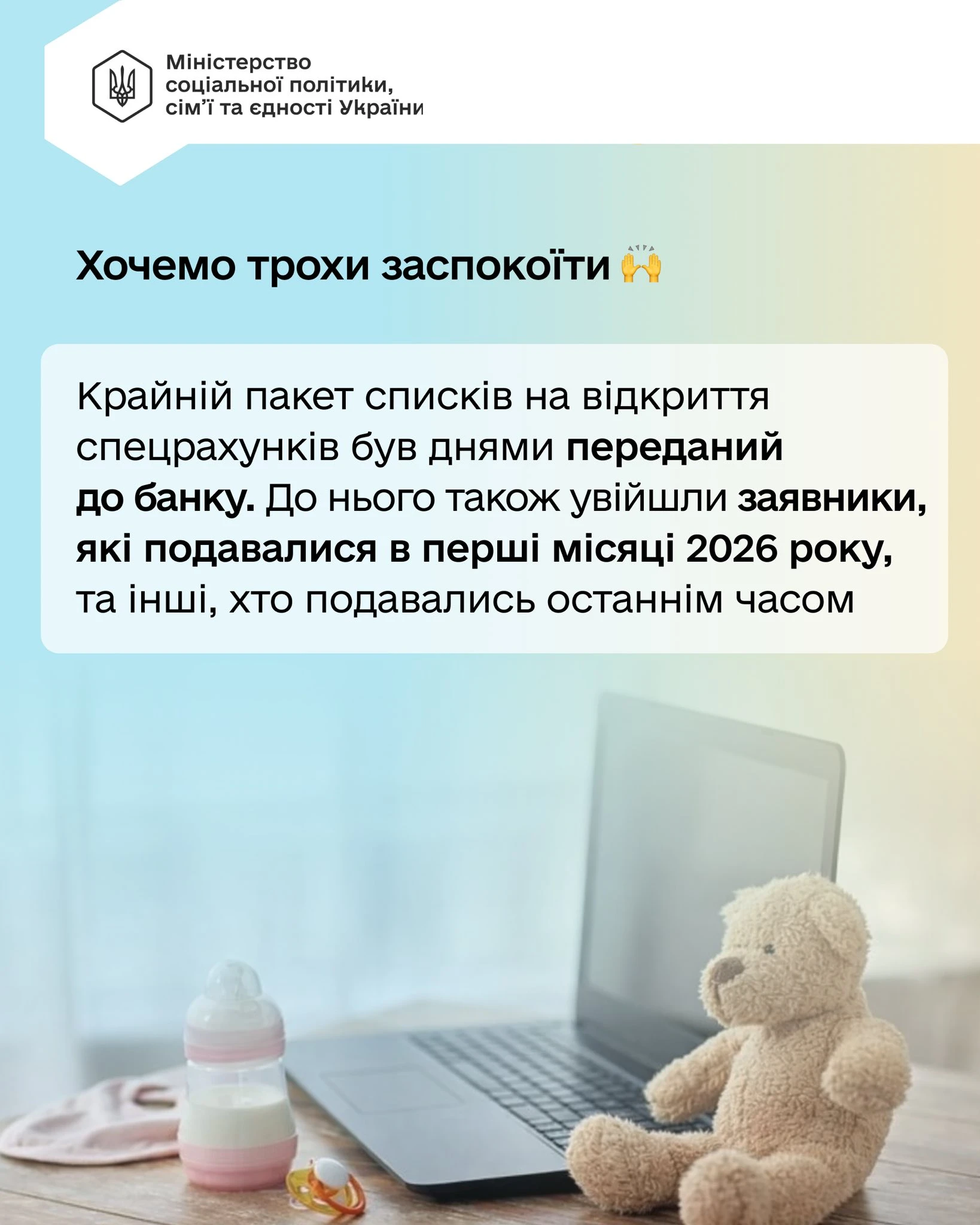 Останнім часом Мінсоцполітики отримує багато запитань щодо «дитячих» виплат – і має хороші новини. Багато з вас уже пишуть, що спецрахунки відкрито. Тож Мінсоцполітики коротко пояснює, як це працює, якщо ви ще очікуєте відкриття рахунку.