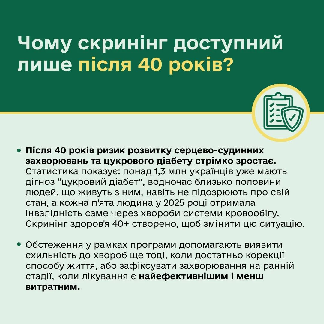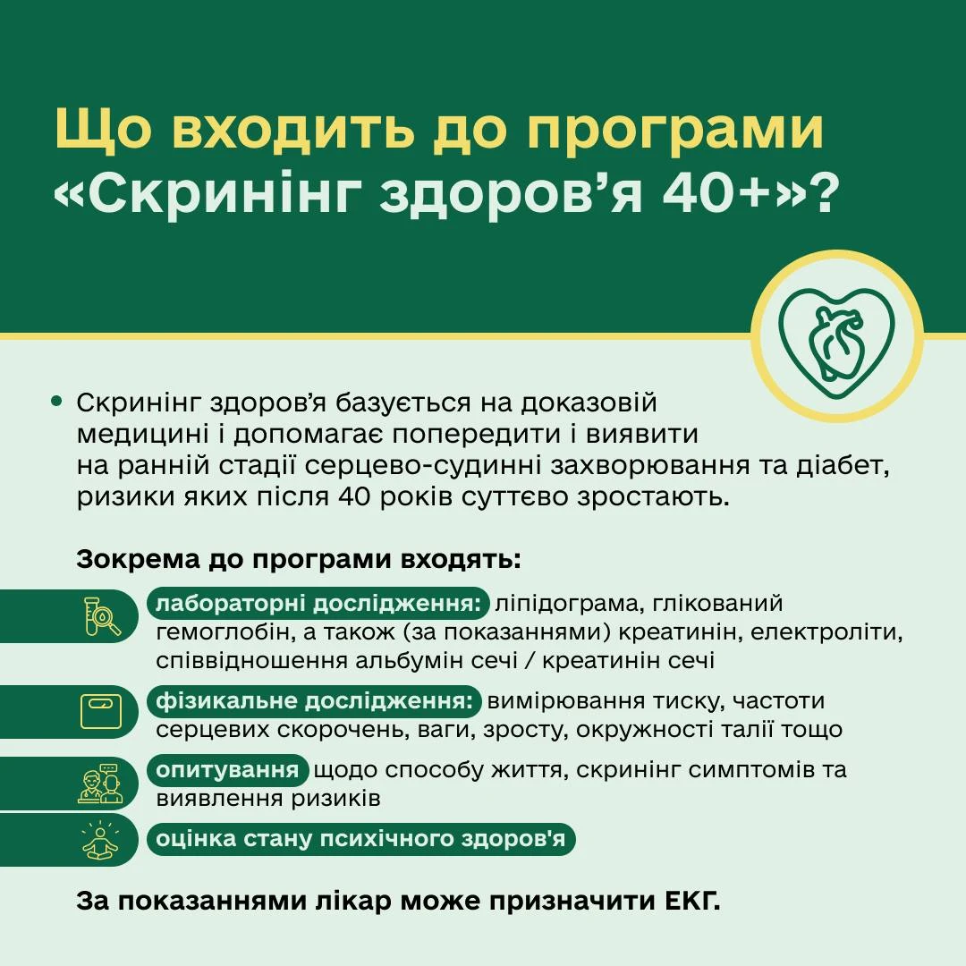 «Скринінг здоров’я 40+» – це програма раннього виявлення серцево-судинних захворювань, цукрового діабету та розладів психічного здоров’я, яка стартувала в Україні на початку 2026 року.