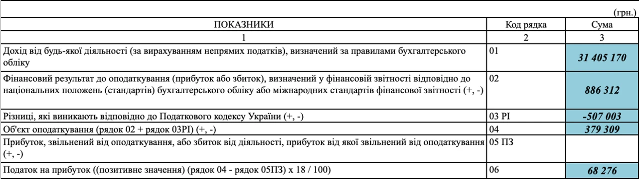 Для цього беремо фінрезультат (у прикладі 886 312 грн) і зменшуємо його на податкові різниці. Через це об’єкт оподаткування зменшується, і податок на прибуток рахуємо вже з нової бази – 18% становить 68 276 грн.