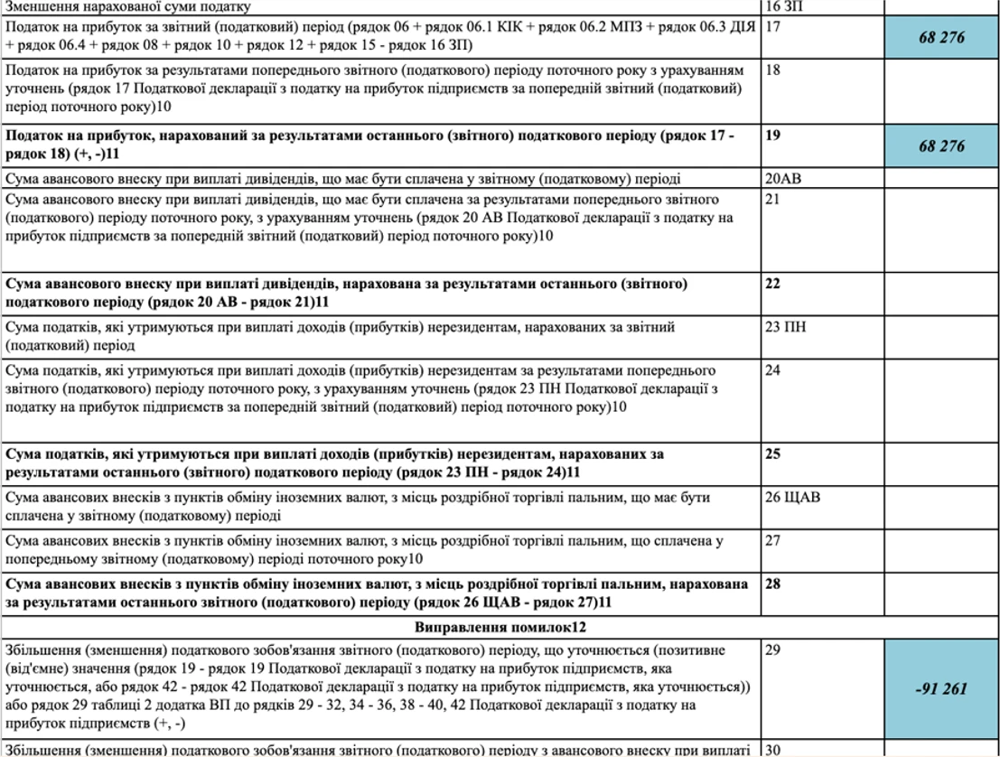 І тепер ключове: виправний блок. Якщо його не заповнити, подання уточнюючої Декларації фактично не матиме жодного ефекту. В описаному випадку це рядок 29. Тут ми показуємо різницю між уточненим податковим зобов’язанням і тим, що було задеклароване раніше (помилкове). Тобто: нове зобов’язання мінус старе. У результаті отримуємо від’ємне значення (за прикладом - 91 261 грн), адже нова сума менша за попередню. І тут дуже важливо не загубити знак «мінус». Якщо поставити просто «91 261» без мінуса, система сприйме це як збільшення зобов’язання – і в інтегрованій картці платника з’явиться донарахування на цю суму. Тобто, ефект буде такий що замість того, щоб зняти зобов’язання, ми його донарахуємо та подвоїмо. Це, до речі, доволі типова помилка. Отже, якщо зменшуємо зобов’язання – у рядку 29 має стояти число з мінусом, якщо збільшуємо (тобто раніше занизили) – буде плюсове значення.