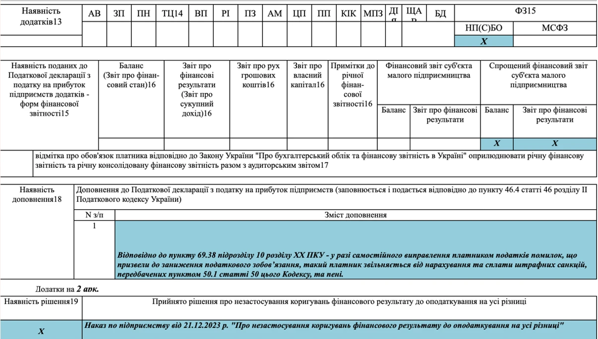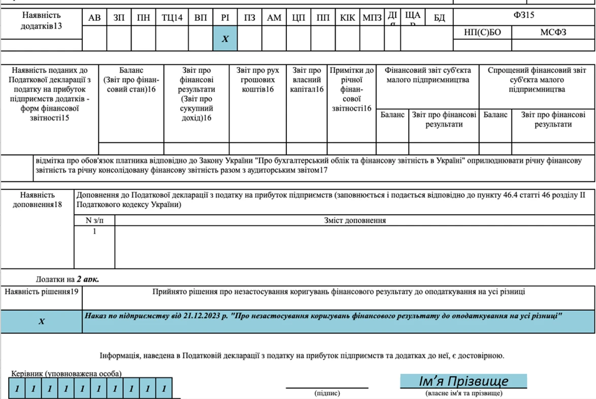 Отже, маємо платника податку на прибуток, малодохідник, без застосування податкових різниць. За результатами 2023 року підприємство отримало від’ємне значення об’єкта оподаткування (рядок 04 Декларації) у сумі 507 003 грн. Важливо: йдеться не про збиток у бухобліку, а саме про показник декларації.