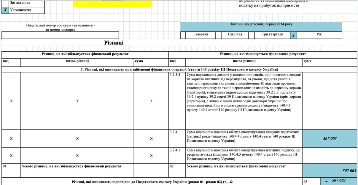 У нашому випадку з’являються зменшувальні податкові різниці (рядок 03 РІ) – саме за рахунок перенесення від’ємного значення. Відповідно, різниці дають «мінус» (у прикладі це «- 507 003»).