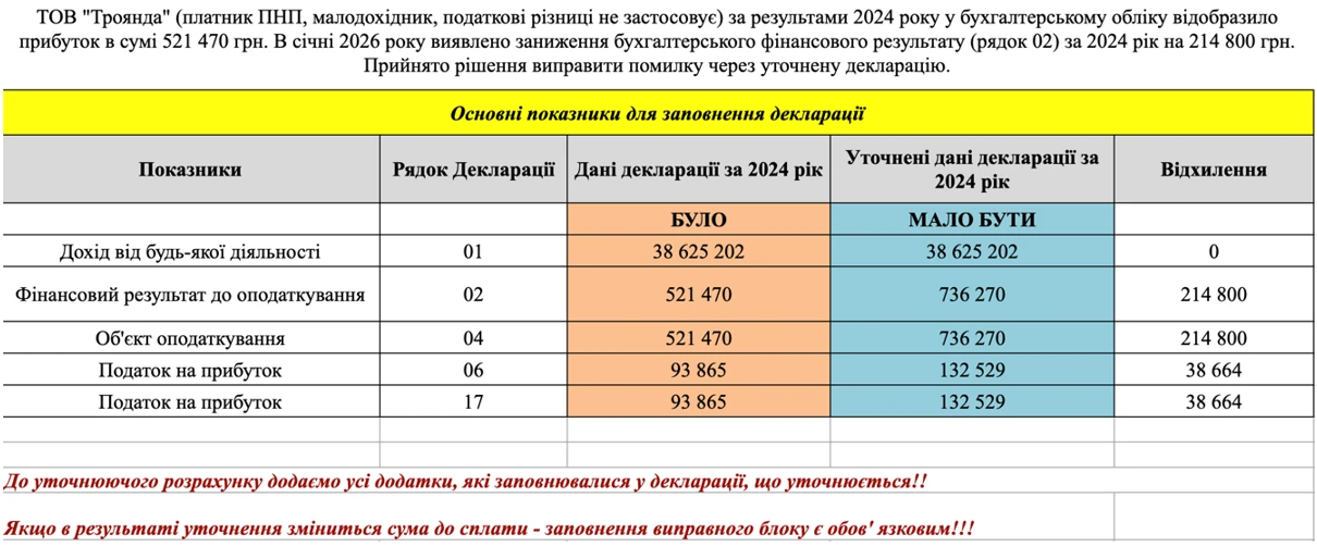 Як бачимо, малодохідник за результатами 2024 року задекларував прибуток у сумі 521 470 грн. У січні 2026 року виявив заниження фінансового результату (рядок 02) за 2024 рік на суму 214 800 грн.