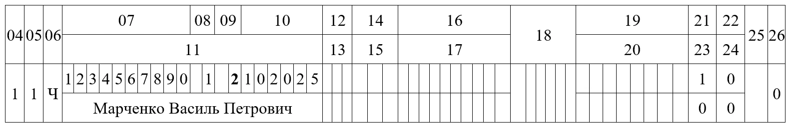 - графа 21 – відображаємо ознаку наявності трудової книжки, тобто «1»;