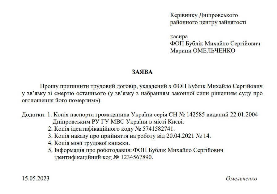 - заяву про припинення трудового договору (далі – заява) з викладенням відповідної інформації про смерть роботодавця – фізичної особи або набрання законної сили рішенням суду про визнання такої фізичної особи безвісно відсутньою чи про оголошення її померлою;