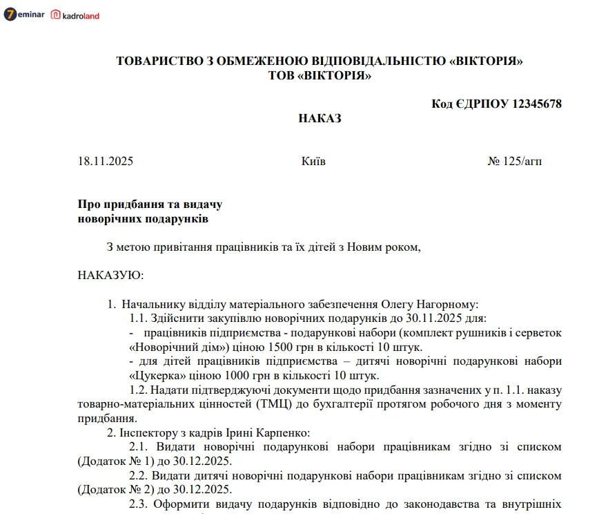 Завантажуйте шаблон та зразок Наказу про придбання та видачу новорічних подарунків