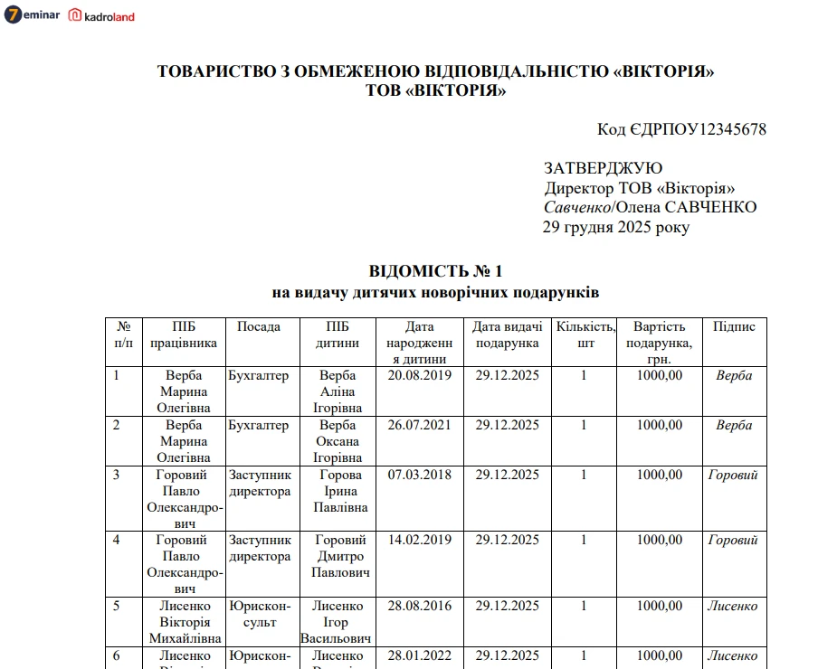 - Видача новорічних подарунків діткам працівників оформлюється відповідною відомістю.