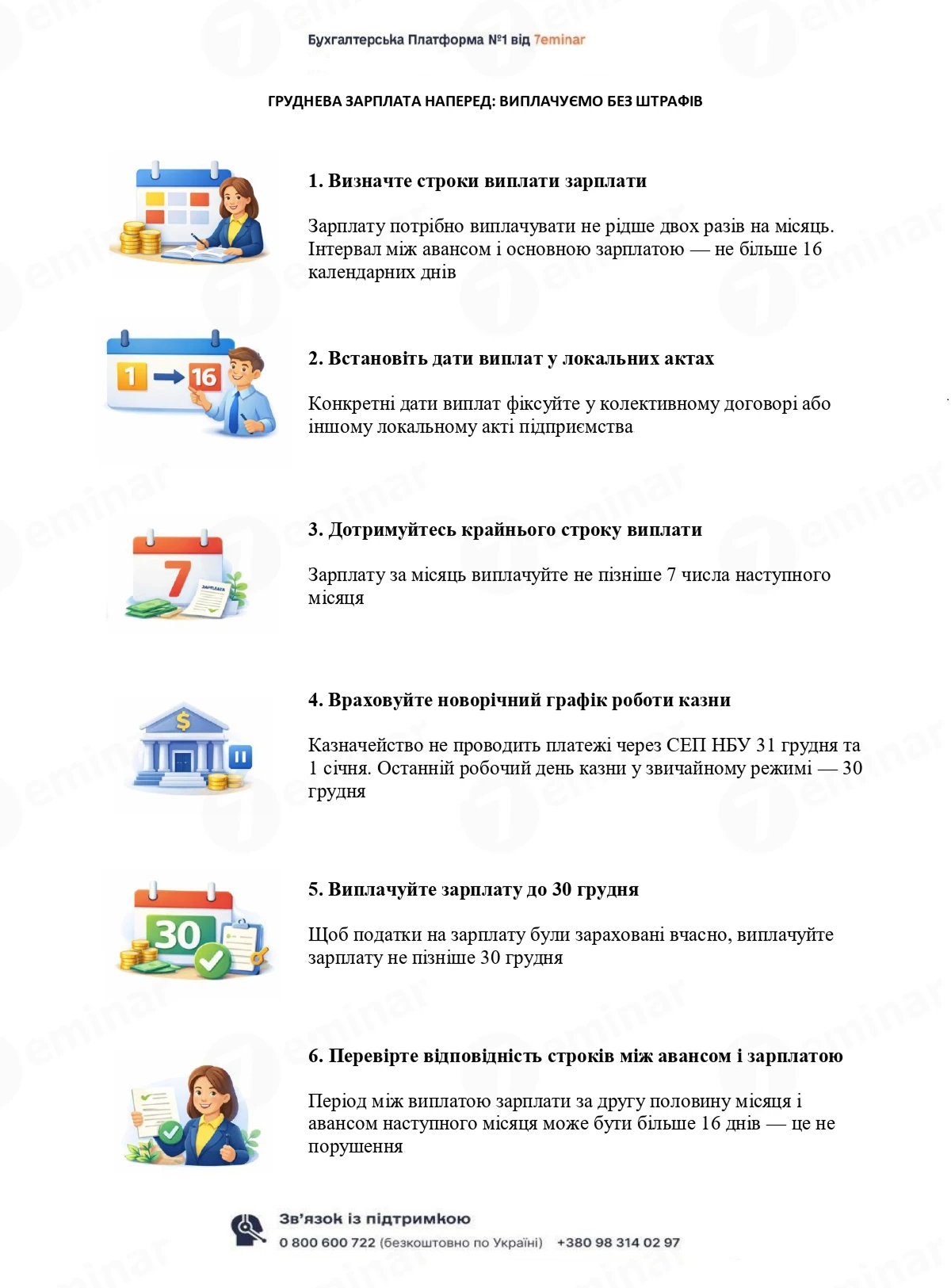 - за місяць виплату зарплати проводьте не пізніше 7 числа після місяця, за який її нараховано.