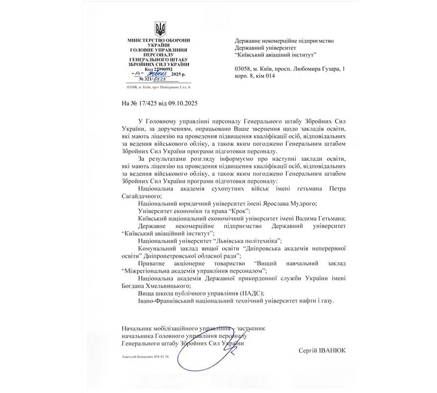 У листі від 14.10.2025 №321/6828 Генштаб ЗСУ надав відповідь на запит Державного некомерційного підприємства Державний університет «Київський авіаційний інститут» щодо закладів освіти, які мають ліцензію на проведення підвищення кваліфікації осіб, відповідальних за ведення військового обліку, і яким програми підготовки погоджено Генеральним штабом Збройних Сил України: