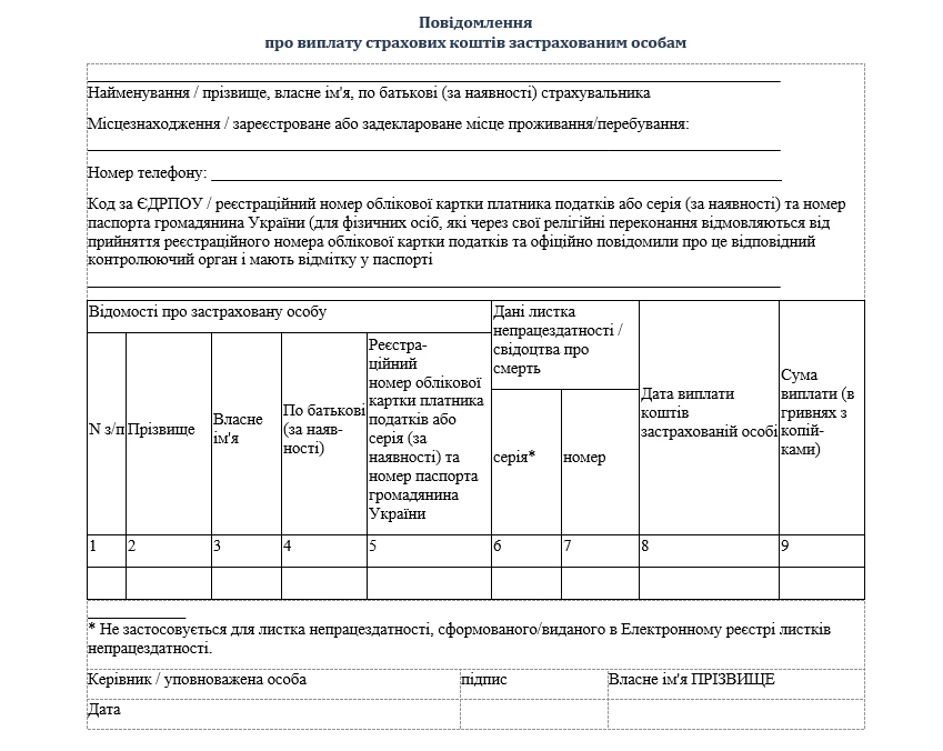 6. Після проведення виплат страхувальник не пізніше 30 календарних днів з дати зарахування страхових коштів на окремий рахунок та набуття заявою-розрахунком статусу «Оплачено» в особистому кабінеті страхувальника на вебпорталі ПФУ подає повідомлення про виплату страхових коштів застрахованим особам за формою.