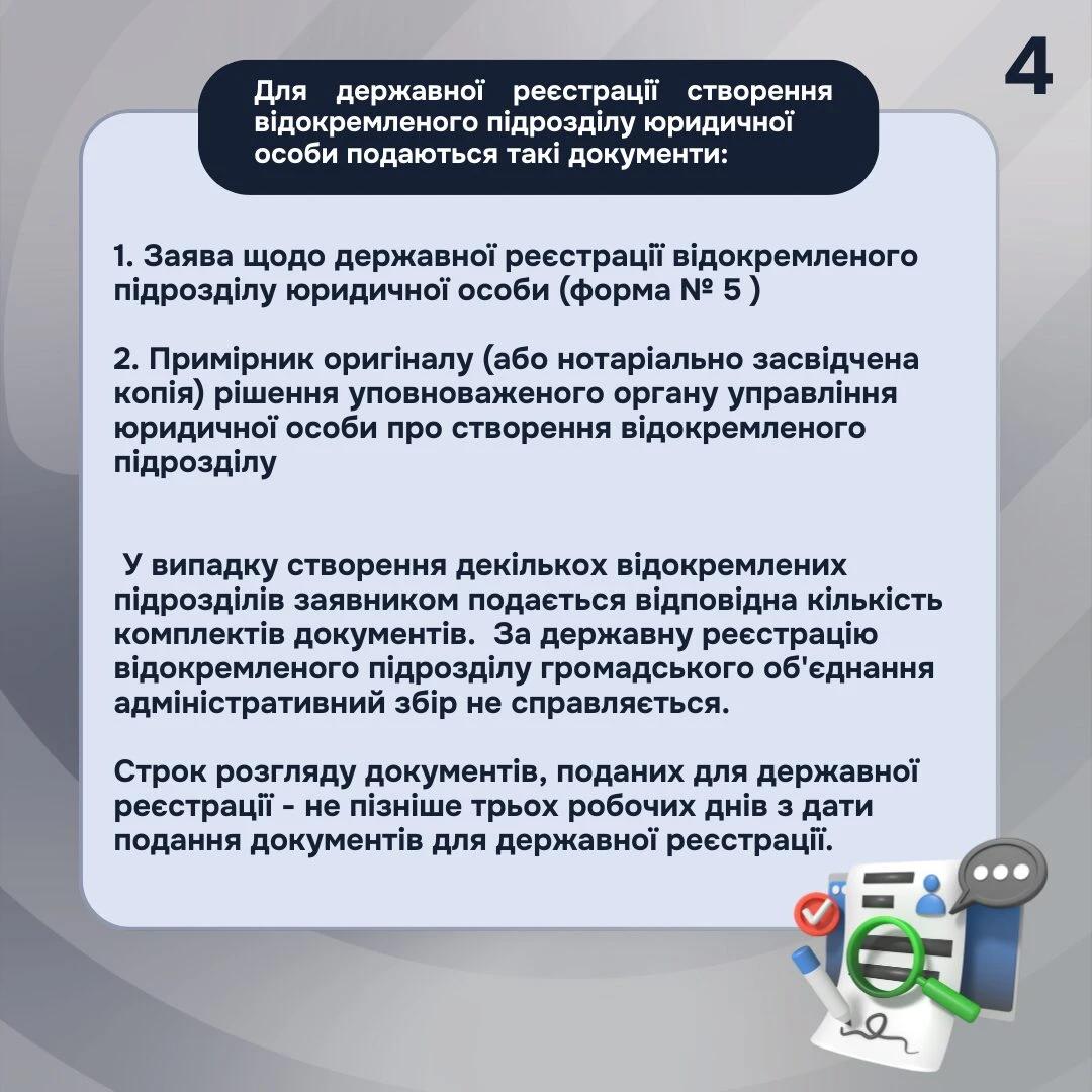 Для державної реєстрації створення відокремленого підрозділу юридичної особи (далі – відокремлений підрозділ) подаються такі документи (ч. 18 ст. 17 Закону України від 15.05.2003 № 755-IV «Про державну реєстрацію юридичних осіб, фізичних осіб – підприємців та громадських формувань», далі – Закон):