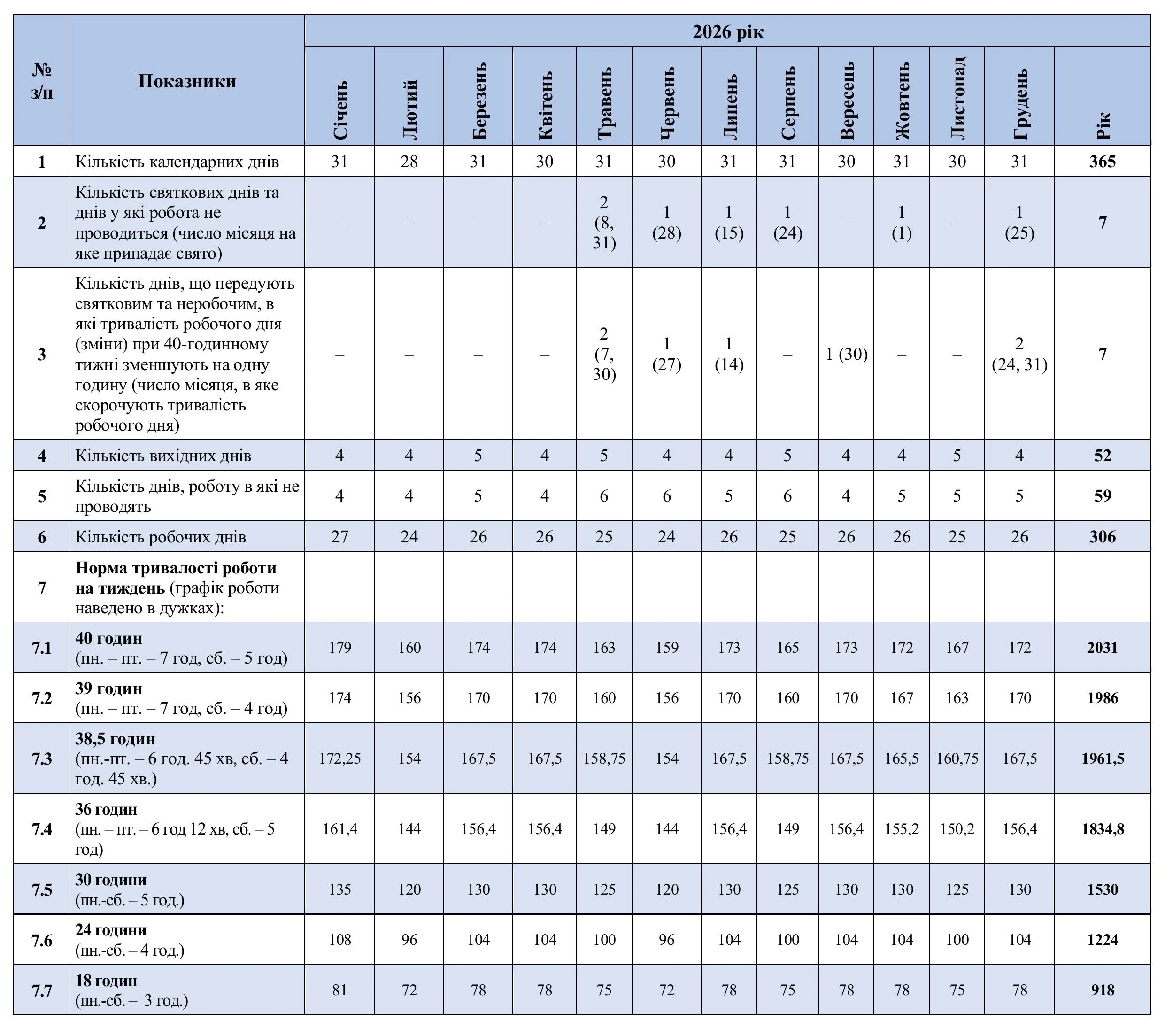 - Норма тривалості робочого часу на 2026 рік за календарем 5-денного робочого тижня