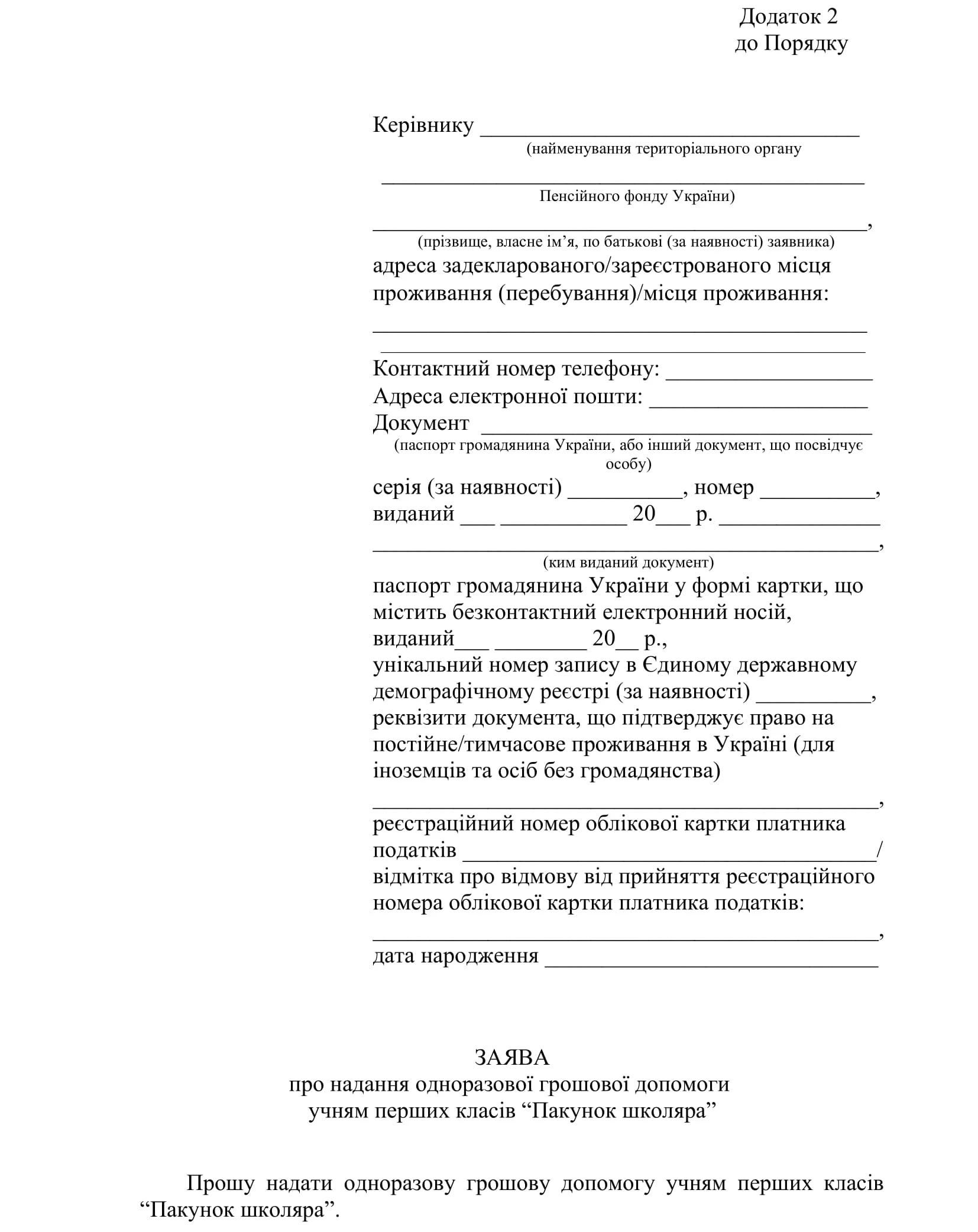 Відомості, необхідні для формування заяви засобами мобільного додатка Порталу Дія (Дія), отримуються з Інтегрованої комплексної інформаційної системи Пенсійного фонду України шляхом електронної інформаційної взаємодії. У разі подання заяви на отримання одноразової грошової допомоги одним із батьків або іншим законним представником учня першого класу заява на отримання одноразової грошової допомоги, подана іншим з батьків або законним представником цього учня, не підлягає розгляду.