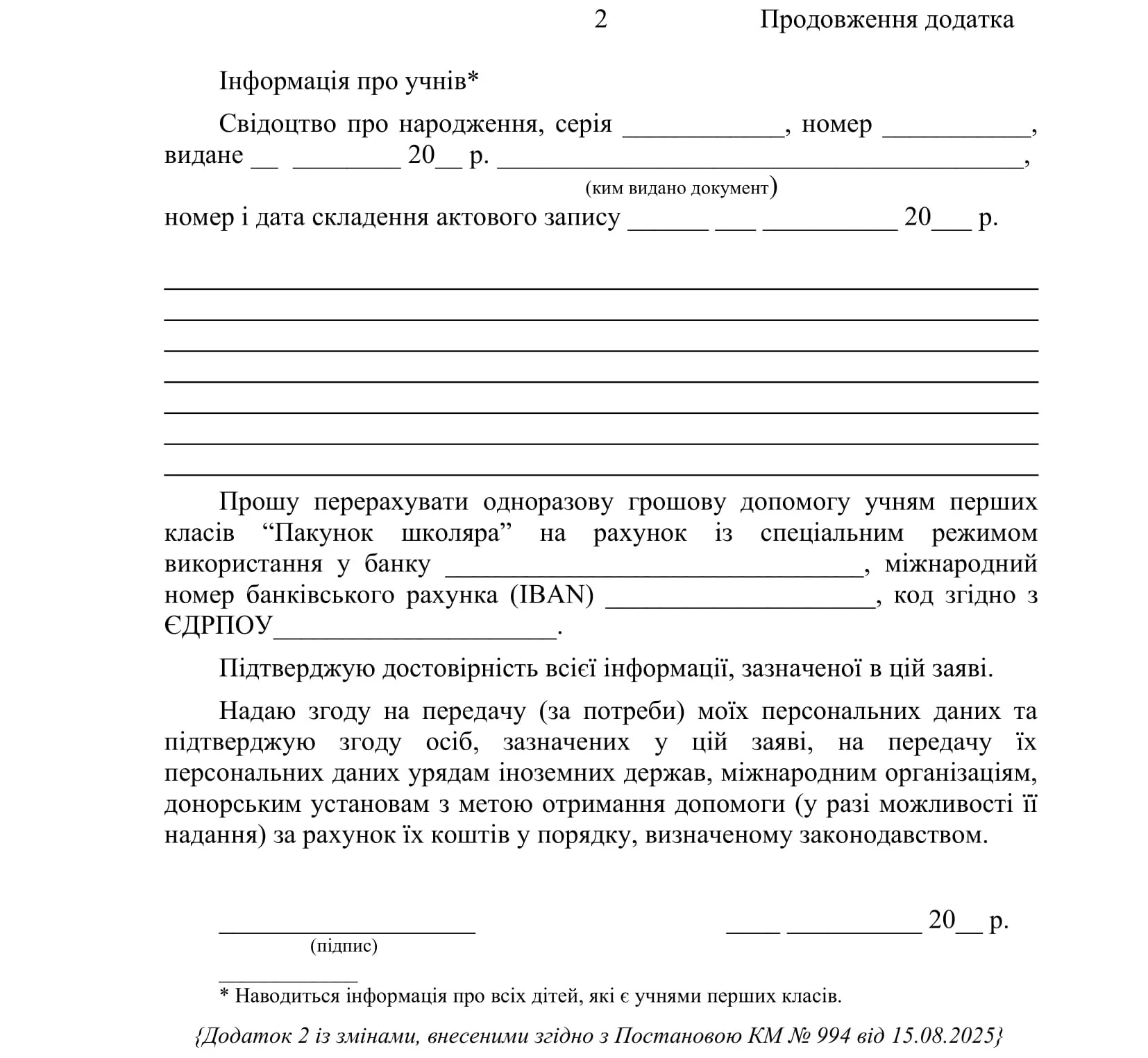Постановою КМУ від 15.08.2025 №994 внесено зміни до Порядку надання одноразової грошової допомоги учням перших класів «Пакунок школяра», затвердженого постановою Кабінету Міністрів України від 07.07.2025 №809 «Деякі питання надання одноразової грошової допомоги учням перших класів «Пакунок школяра».